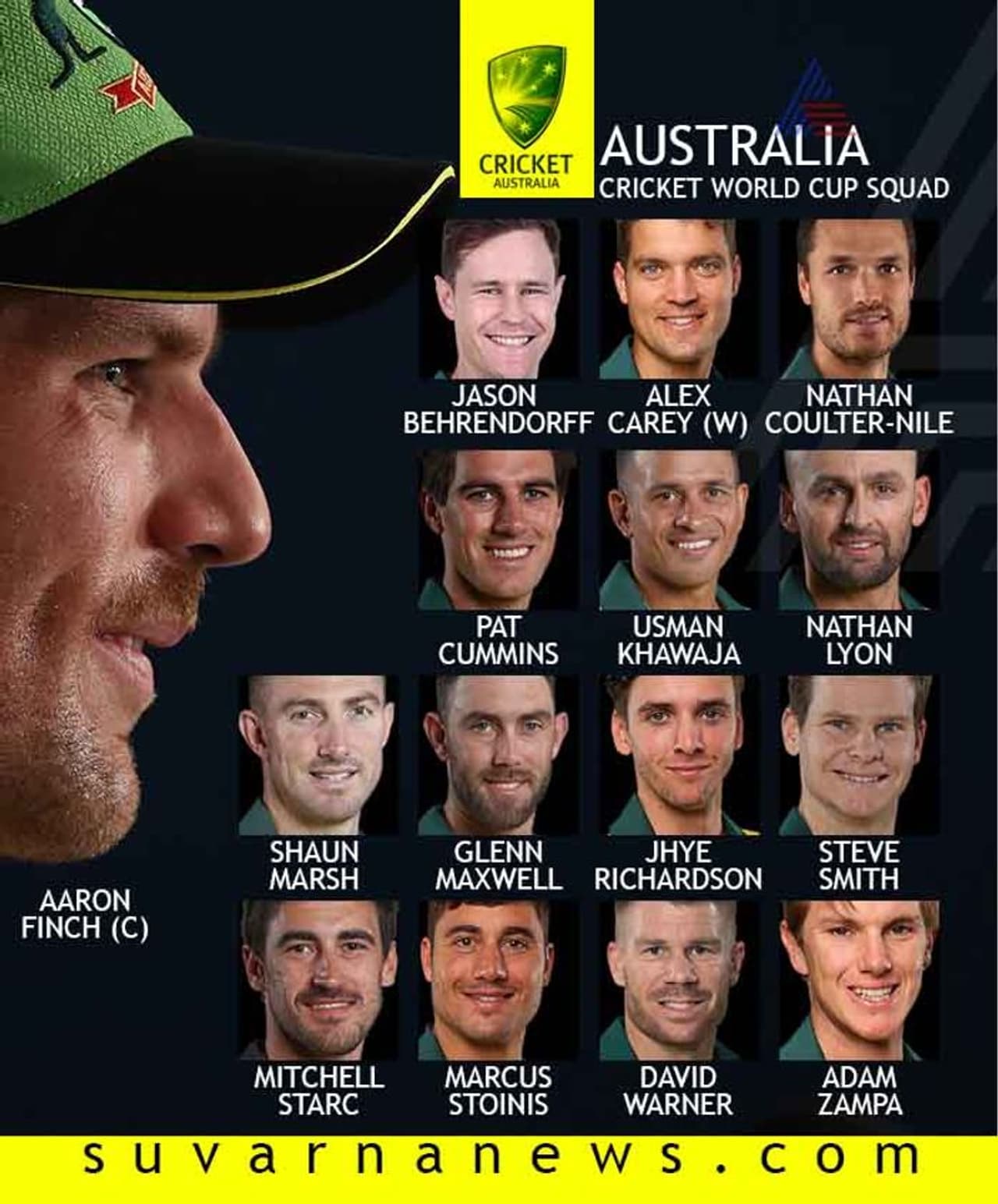 ಆ್ಯರೋನ್ ಫಿಂಚ್[ನಾಯಕ], ಉಸ್ಮಾನ್ ಖವಾಜ, ಡೇವಿಡ್ ವಾರ್ನರ್, ಸ್ಟೀವ್ ಸ್ಮಿತ್, ಶಾನ್ ಮಾರ್ಶ್, ಗ್ಲೇನ್ ಮ್ಯಾಕ್ಸ್’ವೆಲ್, ಮಾರ್ಕಸ್ ಸ್ಟೋಯ್ನಿಸ್, ಅಲೆಕ್ಸ್ ಕೆರ್ರಿ, ಪ್ಯಾಟ್ ಕಮ್ಮಿನ್ಸ್, ಮಿಚೆಲ್ ಸ್ಟಾರ್ಕ್, ಜೇ ರಿಚರ್ಡ್’ಸನ್, ನಾಥನ್ ಕೌಲ್ಡರ್’ನೀಲ್, ಜೇಸನ್ ಬೆಹ್ರನ್’ಡ್ರಾಪ್, ನೇಥನ್ ಲಯನ್, ಆ್ಯಡಂ ಜಂಪಾ.