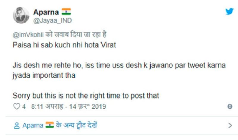 ಪುಲ್ವಾಮ ದಾಳಿ ಖಂಡಿಸದೆ ಖಾಸಗಿ ಜಾಹೀರಾತು ಕುರಿತು ಟ್ವೀಟ್ ಮಾಡಿದ ಟೀಂ ಇಂಡಿಯಾ ನಾಯಕ ವಿರಾಟ್ ಕೊಹ್ಲಿ ವಿರುದ್ಧ ಆಕ್ರೋಶ ವ್ಯಕ್ತವಾಗಿತ್ತು. ತಕ್ಷಣವೇ ಟ್ವೀಟ್ ಡೀಲೀಟ್ ಮಾಡಿದ ಕೊಹ್ಲಿ ಹುತಾತ್ಮ ಯೋಧರು ಹಾಗೂ ಅವರ ಕುಟುಂಬದ ಕುರಿತು ಟ್ವೀಟ್ ಮಾಡಿದ್ದಾರೆ.
