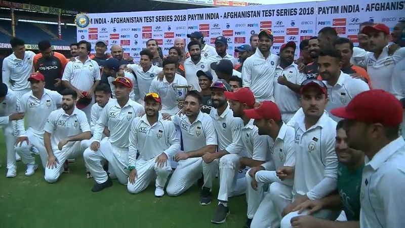ಭಾರತ-ಆಫ್ಘಾನಿಸ್ತಾನ ನಡುವಿನ ಐತಿಹಾಸಿಕ ಟೆಸ್ಟ್ ಪಂದ್ಯಕ್ಕೆ ಬೆಂಗಳೂರಿನ ಎಂ. ಚಿನ್ನಸ್ವಾಮಿ ಮೈದಾನ ಸಾಕ್ಷಿಯಾಗಿತ್ತು. ಐಸಿಸಿ ಟೆಸ್ಟ್ ಮಾನ್ಯತೆ ಪಡೆದ ಬಳಿಕ ಭಾರತದ ವಿರುದ್ಧ ಚೊಚ್ಚಲ ಪಂದ್ಯವನ್ನಾಡಿದ ಆಫ್ಘಾನಿಸ್ತಾನ ಎರಡು ದಿನದಲ್ಲೇ ಸೋಲೊಪ್ಪಿಕೊಂಡಿತು. ಭಾರತ ಮೊದಲ ಇನ್ನಿಂಗ್ಸ್ನಲ್ಲಿ 474 ರನ್ ಸಿಡಿಸಿ ಆಲೌಟ್ ಆಗಿತ್ತು. ಆದರೆ ಅಫ್ಘಾನಿಸ್ತಾನ ಮೊದಲ ಇನ್ನಿಂಗ್ಸ್ನಲ್ಲಿ 109 ಹಾಗೂ ದ್ವಿತೀಯ ಇನ್ನಿಂಗ್ಸ್ನಲ್ಲಿ 103 ರನ್ಗಳಿಗೆ ಆಲೌಟ್ ಆಗೋ ಮೂಲಕ ಸೋಲಿಗೆ ಶರಣಾಯಿತು. ಟ್ರೋಫಿ ಗೆದ್ದ ಬಳಿಕ ಭಾರತದ ನಾಯಕ ಅಜಿಂಕ್ಯ ರಹಾನೆ, ಫೋಟೋಗೆ ಫೋಸ್ ನೀಡಲು ಆಫ್ಘಾನಿಸ್ತಾನ ತಂಡವನ್ನೂ ಆಹ್ವಾನಿಸಿ ಕ್ರೀಡಾಸ್ಫೂರ್ತಿ ಮೆರೆದರು.