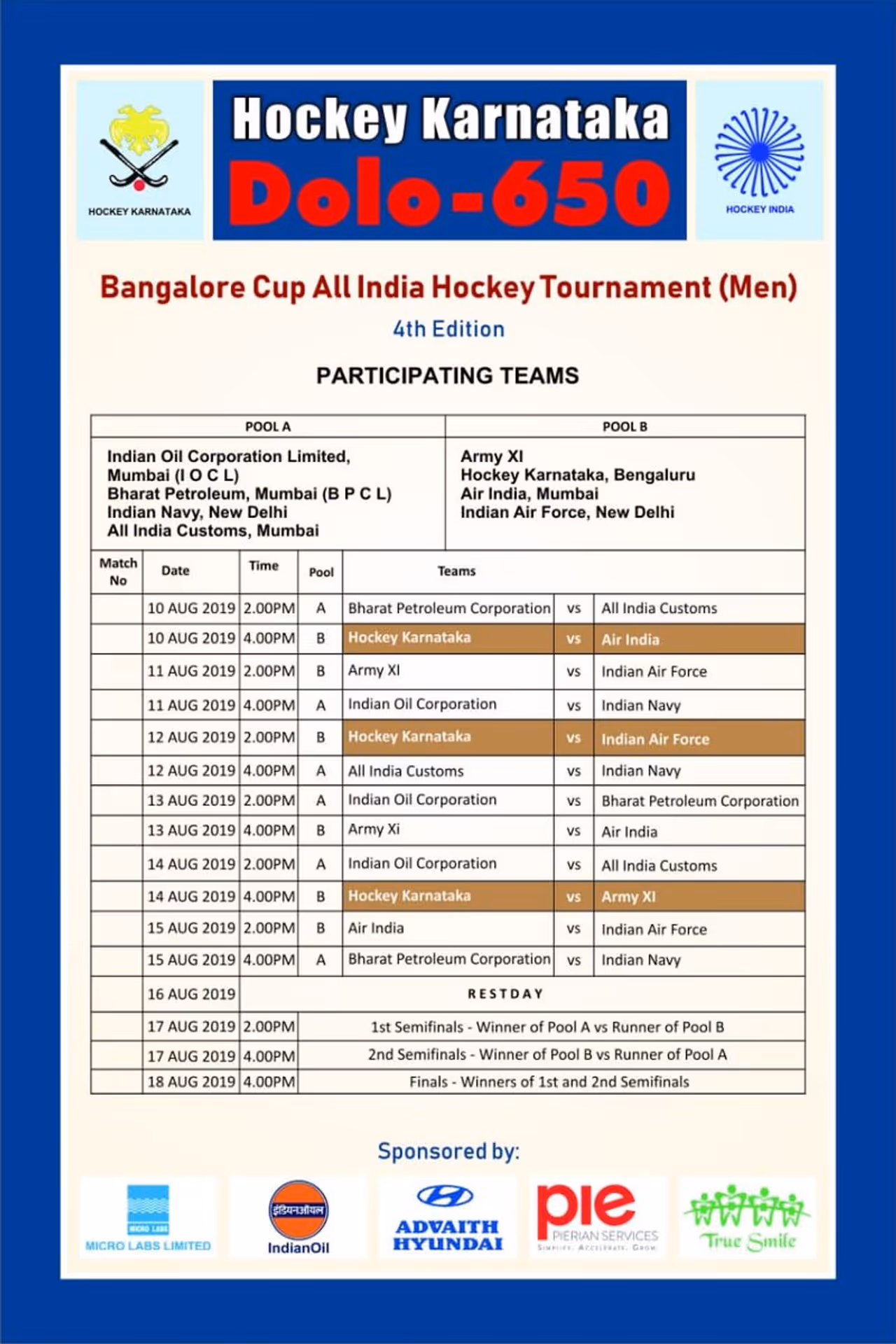 ಬೆಂಗಳೂರು(ಆ.07): ಹಾಕಿ ಕರ್ನಾಟಕ ಆಯೋಜಿಸುತ್ತಿರುವ ಪ್ರತಿಷ್ಠಿತ ಡೋಲೋ 650 ಬೆಂಗಳೂರು ಕಪ್ ಹಾಕಿ ಟೂರ್ನಿಗೆ ಉದ್ಯಾನಗರಿ ಸಜ್ಜಾಗಿದೆ. ಆಗಸ್ಟ್ 10 ರಿಂದ 18ರ ವರೆಗೆ ನಡೆಯಲಿರುವ ಅಖಿಲ ಭಾರತ ಆಹ್ವಾನಿತ ಪುರುಷರ ಹಾಕಿ ಟೂರ್ನಿಯಲ್ಲಿ ದೇಶಿಯ ಮಟ್ಟದ 8 ಅಗ್ರ ತಂಡಗಳು ಕಾದಾಟ ನಡೆಸಲಿವೆ.