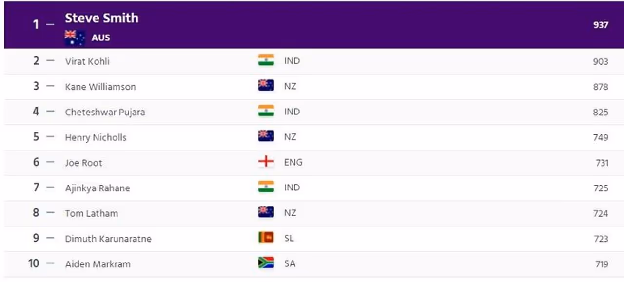 ಸ್ಟೀವ್ ಸ್ಮಿತ್ 937 ರೇಟಿಂಗ್ ಅಂಕದೊಂದಿಗೆ ಮೊದಲ ಸ್ಥಾನದಲ್ಲಿದ್ದರೆ, ವಿರಾಟ್ ಕೊಹ್ಲಿ 903 ಅಂಕಗಳೊಂದಿಗೆ 2ನೇ ಸ್ಥಾನದಲ್ಲಿದ್ದಾರೆ. ಚೇತೇಶ್ವರ್ ಪೂಜಾರ 825 ಅಂಕಗಳೊಂದಿಗೆ 4ನೇ ಸ್ಥಾನ ಹಾಗೂ ಅಜಿಂಕ್ಯ ರಹಾನೆ 7ನೇ ಸ್ಥಾನ ಅಲಂಕರಿಸಿದ್ದಾರೆ.