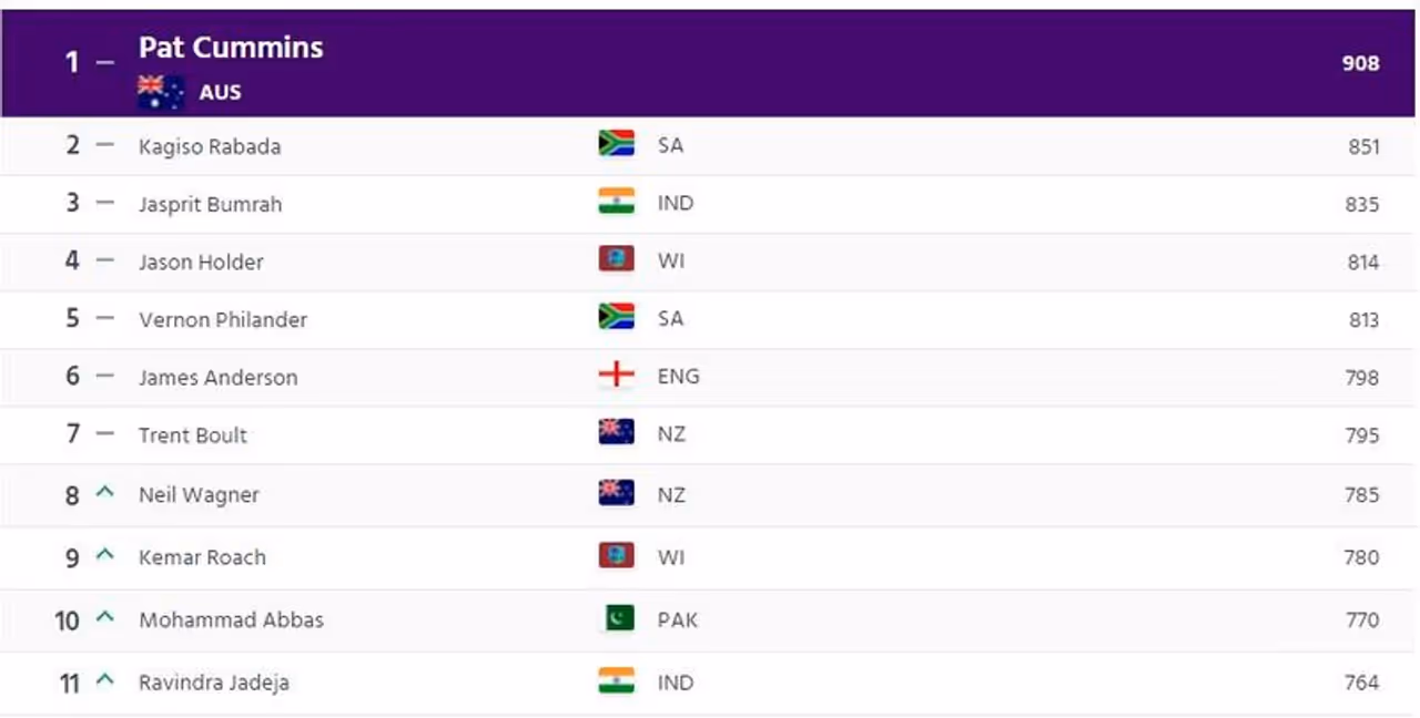 ಬೌಲಿಂಗ್ನಲ್ಲಿ ಆಸ್ಟ್ರೇಲಿಯಾಟ ಪ್ಯಾಟ್ ಕಮಿನ್ಸ್ ಮೊದಲ ಸ್ಥಾನ ಅಲಂಕರಿಸಿದ್ದಾರೆ. ಭಾರತದ ವೇಗಿ ಜಸ್ಪ್ರೀತ್ ಬುಮ್ರಾ 3 ಹಾಗೂ ರವೀಂದ್ರ ಜಡೇಜಾ 11 ನೇ ಸ್ಥಾನ ಪಡೆದಿದ್ದಾರೆ.