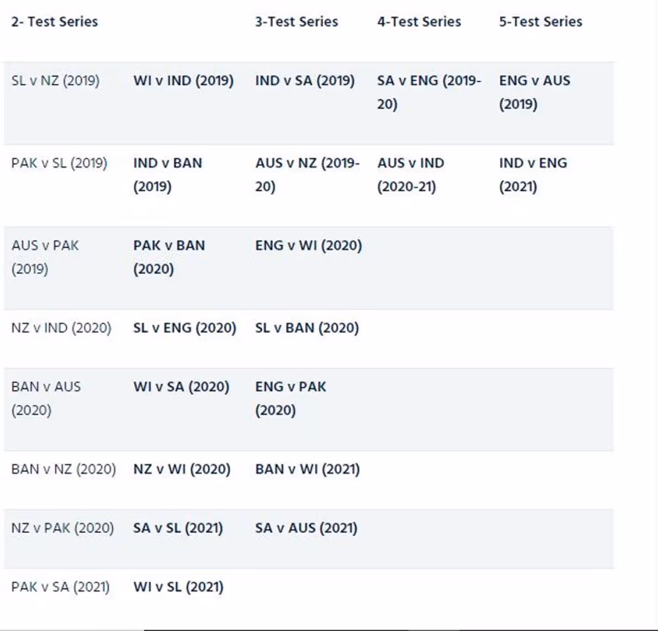 9 ತಂಡಗಳು 6 ಎದುರಾಳಿ ವಿರುದ್ಧ ಪಂದ್ಯ ಆಡಲಿದೆ. 3 ತವರಿನ ಸರಣಿ ಹಾಗೂ 3 ತವರಿನಿಂದಾಚೆಗಿನ ಸರಣಿ. ಪ್ರತಿ ಸರಣಿ 5 ಅಥವಾ 2 ಪಂದ್ಯ ಒಳಗೊಂಡಿರುತ್ತೆ. ಒಟ್ಟು 27 ಟೆಸ್ಟ್ ಸರಣಿ ಹಾಗೂ 71 ಪಂದ್ಯಗಳು ನಡೆಯಲಿವೆ. ಗರಿಷ್ಠ ಅಂಕ ಪಡೆದ 2 ತಂಡಗಳು ಲಾರ್ಡ್ಸ್ ಮೈದಾನದಲ್ಲಿ 2021ರ ಜೂನ್ನಲ್ಲಿ ಫೈನಲ್ ಪಂದ್ಯ ಆಡಲಿದೆ.