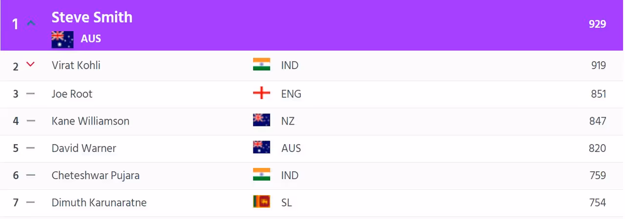 ನೂತನ ಐಸಿಸಿ ಬ್ಯಾಟ್ಸ್ಮನ್ ರ್ಯಾಂಕಿಂಗ್ ಪಟ್ಟಿಯಲ್ಲಿ ಸ್ಟೀವ್ ಸ್ಮಿತ್ ಮತ್ತೆ ಮೊದಲ ಸ್ಥಾನ ಅಲಂಕರಿಸಿದ್ದಾರೆ. ಹೀಗಾಗಿ ವಿರಾಟ್ ಕೊಹ್ಲಿ ಎರಡನೇ ಸ್ಥಾನಕ್ಕೆ ಕುಸಿದಿದ್ದಾರೆ. ಇಂಗ್ಲೆಂಡ್ ನಾಯಕ ಜೋ ರೂಟ್ 3ನೇ ಸ್ಥಾನ ಪಡೆಯುವಲ್ಲಿ ಯಶಸ್ವಿಯಾಗಿದ್ದಾರೆ. ಚೇತೇಶ್ವರ್ ಪೂಜಾರ 6ನೇ ಸ್ಥಾನ ಅಲಂಕರಿಸಿದ್ದಾರೆ. ಟಾಪ್ ಟೆನ್ ಟೆಸ್ಟ್ ಬ್ಯಾಟ್ಸ್ಮನ್ಗಳಲ್ಲಿ ವಿರಾಟ್ ಕೊಹ್ಲಿ ಹಾಗೂ ಪೂಜಾರ ಸ್ಥಾನ ಪಡೆದಿದ್ದಾರೆ.