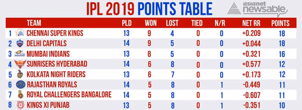 ಶನಿವಾರ ನಡೆದ ರಾಜಸ್ಥಾನ ರಾಯಲ್ಸ್-ಡೆಲ್ಲಿ ಕ್ಯಾಪಿಟಲ್ಸ್ ನಡುವಿನ ಪಂದ್ಯದಲ್ಲಿ ಡೆಲ್ಲಿ ಭರ್ಜರಿ ಜಯಸಾಧಿಸುವ ಮೂಲಕ ಅಂಕಪಟ್ಟಿಯಲ್ಲಿ ಎರಡನೇ ಸ್ಥಾನವನ್ನು ಮತ್ತಷ್ಟು ಭದ್ರಪಡಿಸಿಕೊಂಡಿದೆ. ಇನ್ನು ಬೆಂಗಳೂರಿನಲ್ಲಿ ನಡೆದ ಎರಡನೇ ಪಂದ್ಯದಲ್ಲಿ ಹೈದರಾಬಾದ್ ತಂಡಕ್ಕೆ ಆಘಾತ ನೀಡಿದ ರಾಯಲ್ ಚಾಲೆಂಜರ್ಸ್ ಬೆಂಗಳೂರು ತಂಡವು ಅಂಕಪಟ್ಟಿಯಲ್ಲಿ ಒಂದು ಸ್ಥಾನ ಮೇಲೇರಿದ್ದು 7ನೇ ಸ್ಥಾನಕ್ಕೆ ಲಗ್ಗೆಯಿಡುವುದರ ಮೂಲಕ 12ನೇ ಆವೃತ್ತಿಯ ಐಪಿಎಲ್’ನಲ್ಲಿ ತನ್ನ ಅಭಿಯಾನ ಅಂತ್ಯಗೊಳಿಸಿದೆ.