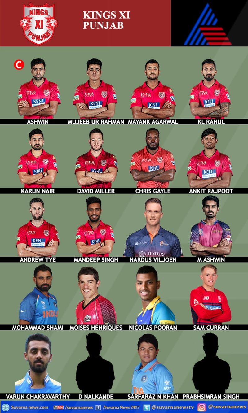 ಆರ್ ಅಶ್ವಿನ್, ಕೆಎಲ್ ರಾಹುಲ್, ಕ್ರಿಸ್ ಗೇಲ್, ಮಯಾಂಕ್ ಅಗರ್ವಾಲ್, ಅಂಕಿತ್ ರಜಪೂತ್, ಮುಜೀಬ್ ರಹೆಮಾನ್, ಕರುಣ್ ನಾಯರ್, ಡೇವಿಡ್ ಮಿಲ್ಲರ್,