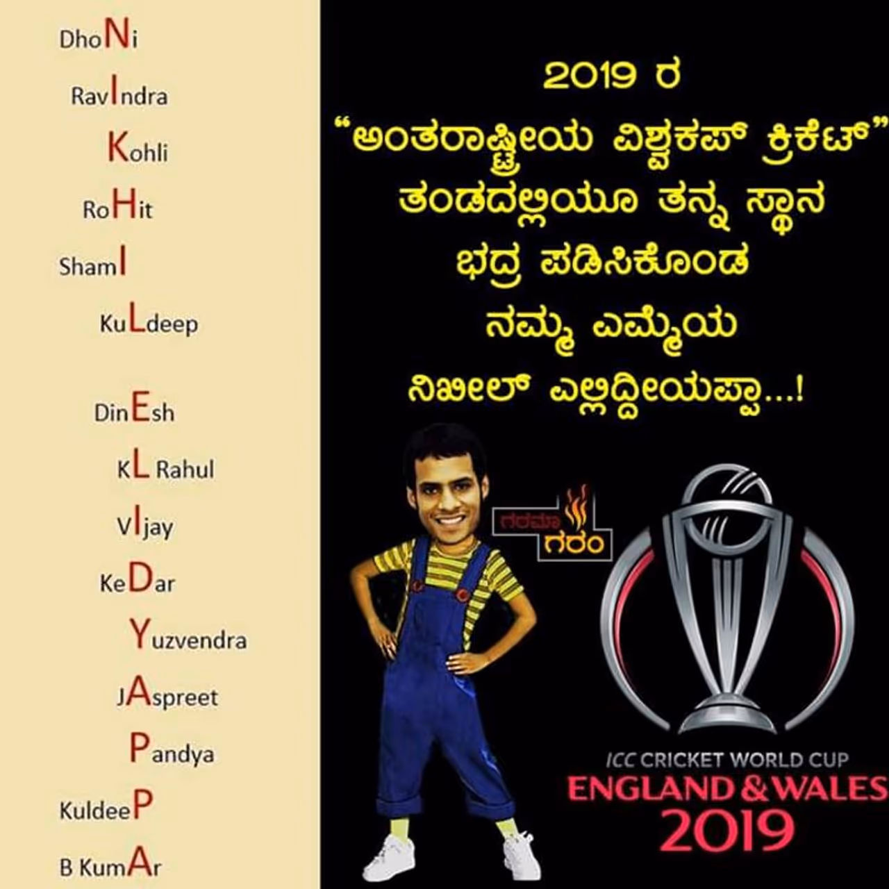 ವಿಶ್ವಕಪ್ ತಂಡಕ್ಕೆ ಆಯ್ಕೆಯಾಗಿರುವ 15 ಸದಸ್ಯರ ಹೆಸರನ್ನು ಒಂದರ ಕೆಳಗೊಂದರಂತೆ ಜೋಡಿಸಿದರೆ ನಿಖಿಲ್ ಎಲ್ಲಿದ್ದಿಯಪ್ಪಾ ಅನ್ನೋ ಹೆಸರು ಅವಿಷ್ಕರಿಸಿದ್ದಾರೆ. ಇದೀಗ ಸಾಮಾಜಿಕ ಜಾಲತಾಣದಲ್ಲಿ ಟೀಂ ಇಂಡಿಯಾದಲ್ಲೂ ನಿಖಿಲ್ ಎಲ್ಲಿದ್ದಿಯಪ್ಪಾ ಹರಿದಾಡುತ್ತಿದೆ. ಚುನಾವಣೆ ಮುಗಿದು ಫಲಿತಾಂಶ ಪ್ರಕಟವಾದರೂ ನಿಖಿಲ್ ಎಲ್ಲಿದ್ದಿಯಪ್ಪ ಮಾತ್ರ ಸದ್ಯಕ್ಕೆ ತಣ್ಣಗಾಗೋ ಲಕ್ಷಣಗಳು ಕಾಣಿಸುತ್ತಿಲ್ಲ.