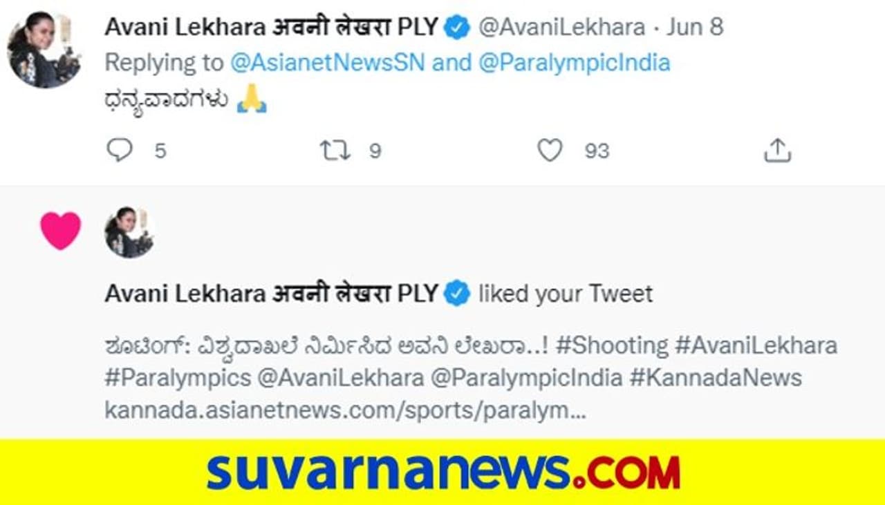 ಬೆಂಗಳೂರು(ಜೂ.09): ಇತ್ತೀಚೆಗಷ್ಟೇ ನಡೆದ ಪ್ಯಾರಾ ಶೂಟಿಂಗ್ ವಿಶ್ವಕಪ್ ಟೂರ್ನಿಯಲ್ಲಿ ವಿಶ್ವದಾಖಲೆಯೊಂದಿಗೆ ಚಿನ್ನದ ಪದಕ ಜಯಿಸಿದ ಪ್ಯಾರಾಲಿಂಪಿಕ್ಸ್ ಚಾಂಪಿಯನ್ ಅವನಿ ಲೇಖರಾ (Avani Lekhara) ಅವರ ಕುರಿತಂತೆ ಏಷ್ಯಾನೆಟ್ ಸುವರ್ಣ ನ್ಯೂಸ್.ಕಾಂ ಸುದ್ದಿ ಪ್ರಕಟಿಸಿತ್ತು. ಈ ಸುದ್ದಿ ನೋಡಿ ಮೆಚ್ಚಿಕೊಂಡಿರುವ ಚಾಂಪಿಯನ್ ಶೂಟರ್ ಅವನಿ ಟ್ವೀಟ್ ಮೂಲಕ ಏಷ್ಯಾನೆಟ್ ಸುವರ್ಣ ನ್ಯೂಸ್.ಕಾಂಗೆ ಕನ್ನಡದಲ್ಲೇ ಅಭಿನಂದನೆಗಳನ್ನು ಸಲ್ಲಿಸಿದ್ದಾರೆ