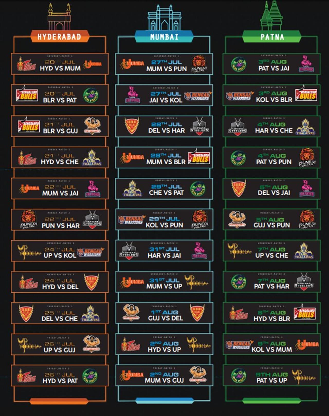 ಜುಲೈ 20 ರಂದು ಆರಂಭಗೊಳ್ಳಲಿರುವ ಪ್ರೊ ಕಬಡ್ಡಿ ಟೂರ್ನಿ ಅಕ್ಟೋಬರ್ 19 ರಂದು ನಡೆಯಲಿರುವ ಫೈನಲ್ ಪಂದ್ಯದೊಂದಿಗೆ ಅಂತ್ಯವಾಗಲಿದೆ. ಜುಲೈ 20ರ 2ನೇ ಪಂದ್ಯದಲ್ಲಿ ಹಾಲಿ ಚಾಂಪಿಯನ್ ಬೆಂಗಳೂರು ಬುಲ್ಸ್ ಹಾಗೂ ಪಾಟ್ನಾ ಪೈರೇಟ್ಸ್ ಮುಖಾಮುಖಿಯಾಗಲಿದೆ.