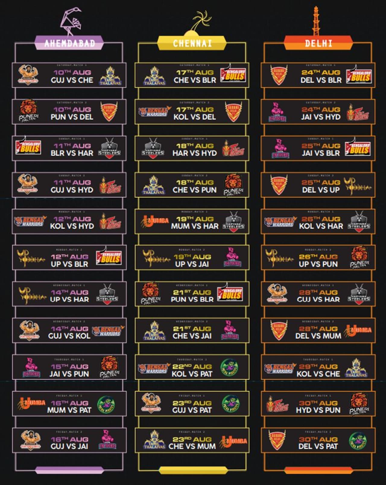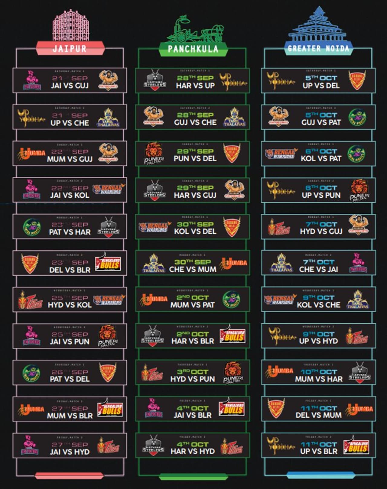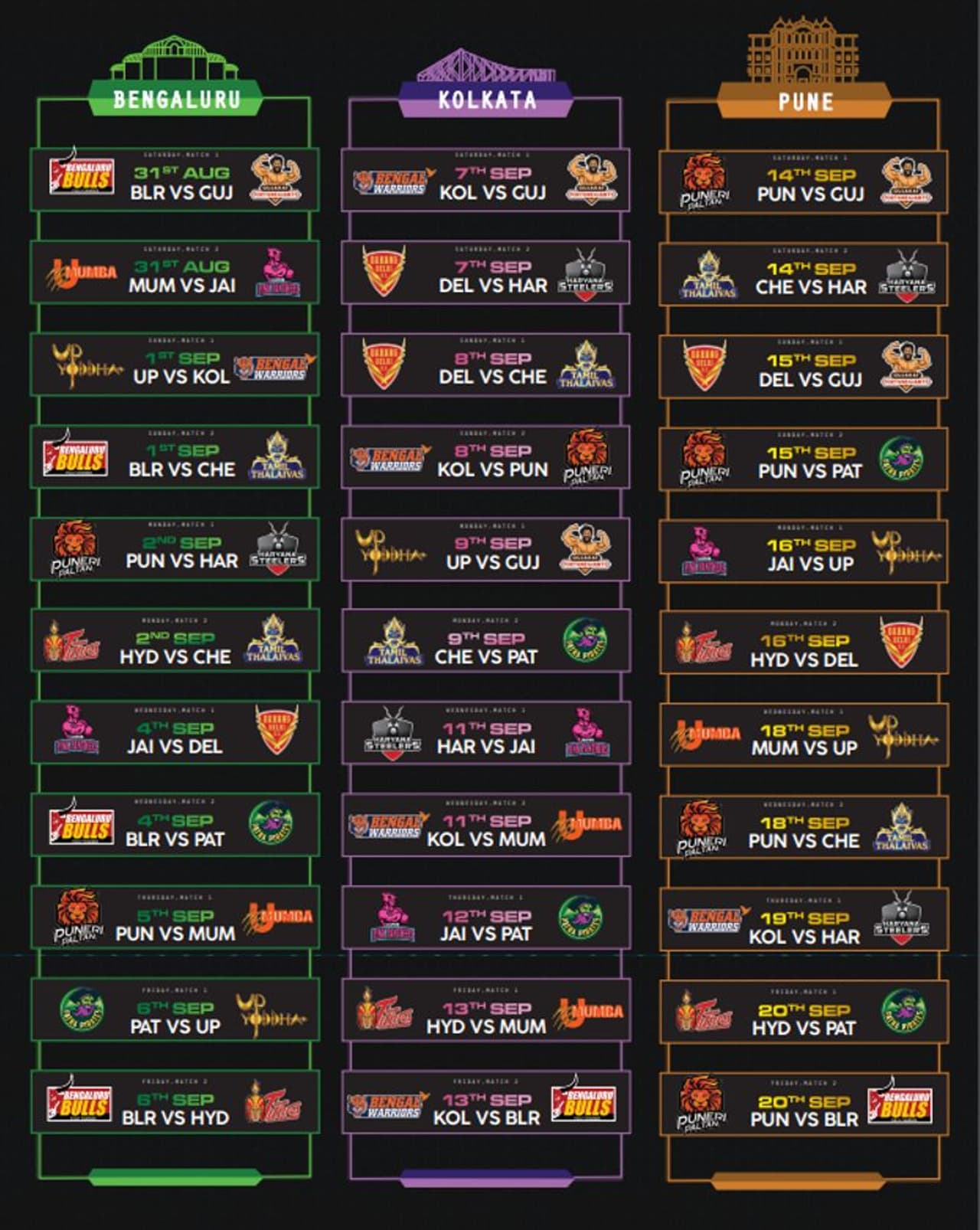 ಬೆಂಗಳೂರು ಚರಣದ ಪಂದ್ಯಗಳು ಆಗಸ್ಟ್ 31 ರಿಂದ ಆರಂಭಗೊಳ್ಳಲಿದೆ. ಬೆಂಗಳೂರಿನಲ್ಲಿ ಒಟ್ಟು 11 ಪಂದ್ಯಗಳು ನಡೆಯಲಿದೆ. ಆಗಸ್ಟ್ 31 ರಿಂದ ಸೆಪ್ಟೆಂಬರ್ 6 ವರೆಗೆ ಬೆಂಗಳೂರಿನಲ್ಲಿ ಪಂದ್ಯ ಆಯೋಜಿಸಲಾಗಿದೆ. ಪ್ರೊ ಕಬಡ್ಡಿ ಟೂರ್ನಿಯ ಸಂಪೂರ್ಣ ವೇಳಾಪಟ್ಟಿ ಇಲ್ಲಿದೆ.