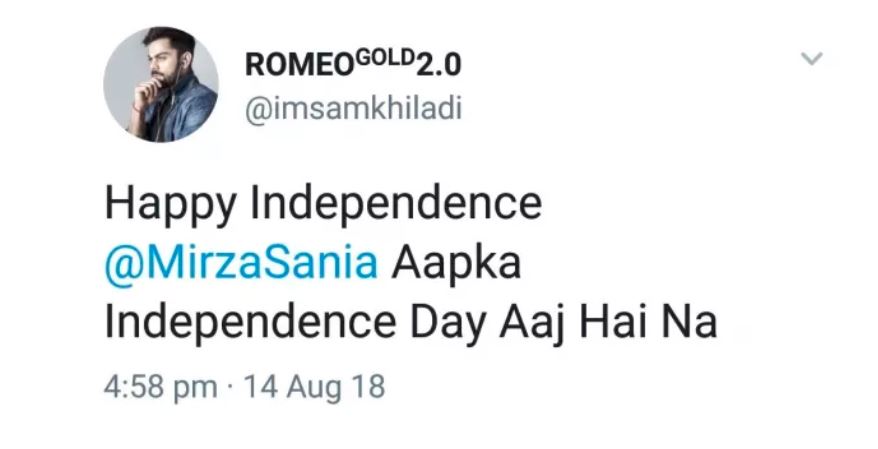 ಟ್ವಿಟರಿಗನೊಬ್ಬ ಸಾನಿಯಾಗೆ ಟ್ವೀಟ್ ಮೂಲಕ ಸಾನಿಯಾ ನಿಮ್ಮ ಸ್ವಾತಂತ್ರ್ಯ ದಿನಾಚರಣೆ ಇಂದೇ(ಆ.14) ಅಲ್ವಾ? ಸ್ವಾತಂತ್ರ್ಯ ದಿನಾಚರಣೆಗೆ ಶುಭಾಶಯ ಎಂದಿದ್ದಾರೆ. ಆಗಸ್ಟ್ 14 ರಂದು ಪಾಕಿಸ್ತಾನ ಸ್ವಾತಂತ್ರ್ಯ ದಿನಾಚರಣೆ. ಹೀಗಾಗಿ ಟ್ವಿಟರಿಗೆ, ಸಾನಿಯಾ ಪಾಕಿಸ್ತಾನದ ಸ್ವಾತಂತ್ರ್ಯ ದಿನಾಚರಣೆಯನ್ನ ಆಚರಿಸುತ್ತಿದ್ದಾರೆ ಎಂದು ಸೂಕ್ಷ್ಮವಾಗಿ ಹೇಳಿದ್ದಾನೆ.