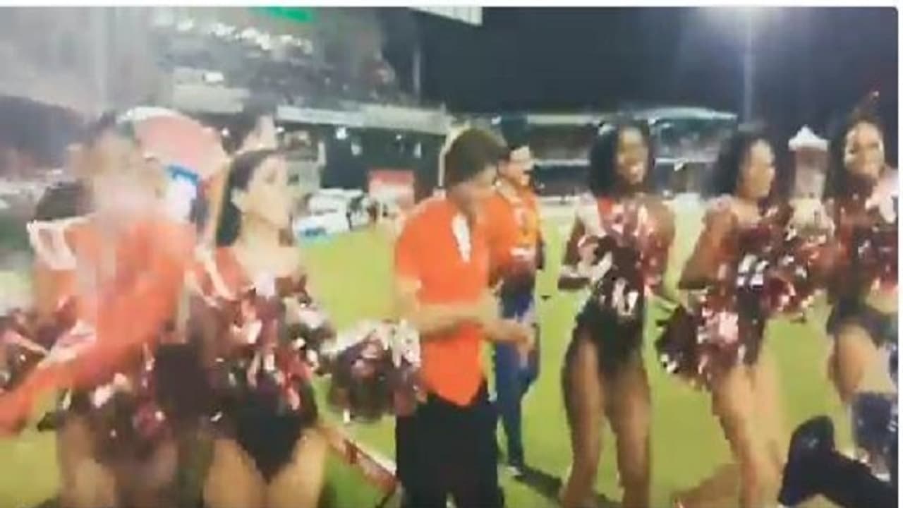ಶಾರುಖ್ ಖಾನ್ ಸಹ ಮಾಲೀಕತ್ವದ ಟ್ರಿನ್ಬ್ಯಾಗೋ ನೈಟ್ ರೈಡರ್ಸ್ ತಂಡದ ಬ್ಯಾಟಿಂಗ್ ಮುಗಿದ ತಕ್ಷಣ ಚೀಯರ್ಸ್ ಲೀಡರ್ಗಳೊಂದಿಗೆ ಹೆಜ್ಜೆ ಹಾಕುತ್ತ ಅಭಿಮಾನಿಗಳತ್ತ ಕೈ ಬೀಸುತ್ತ ಸಾಗಿದ್ದಾರೆ.