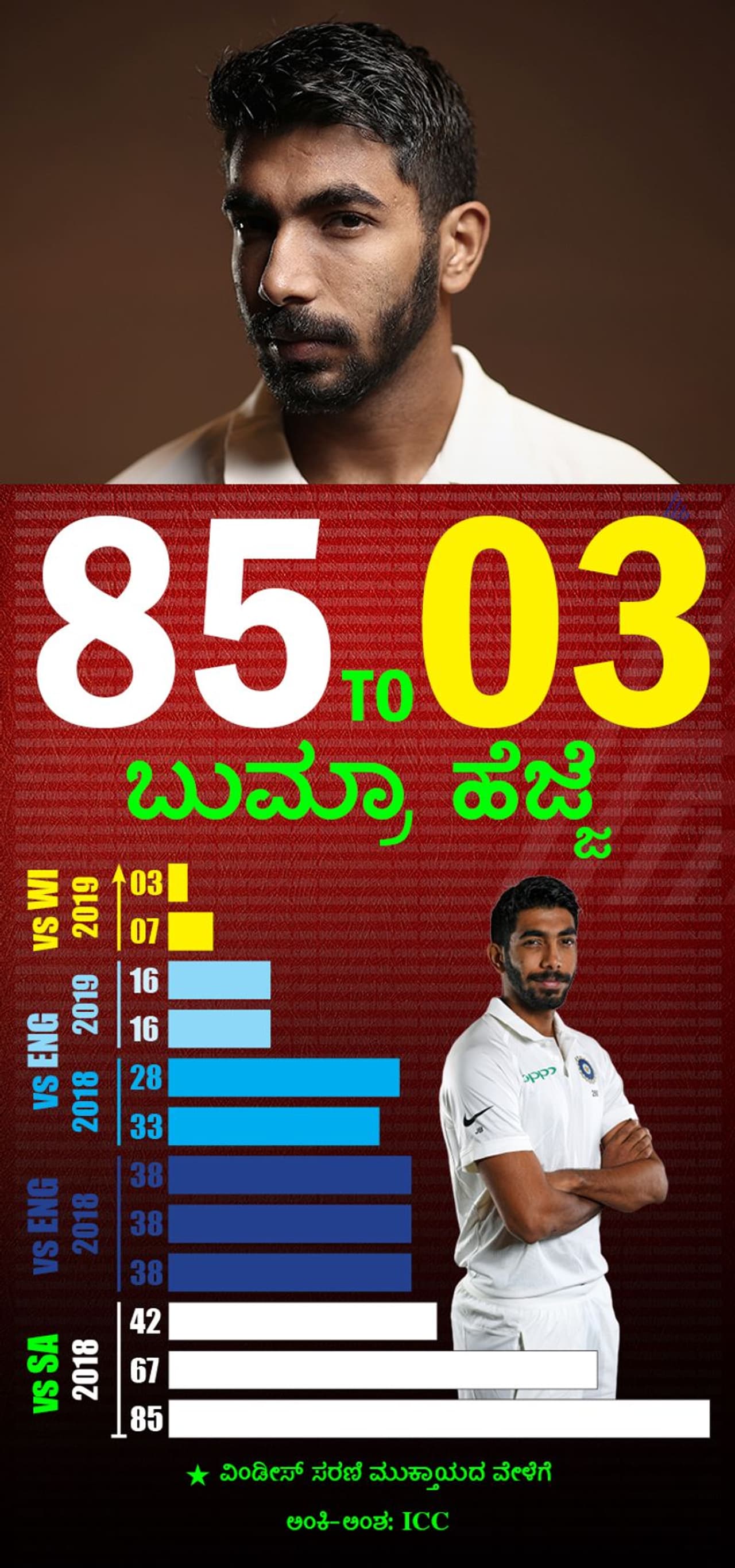 ಬುಮ್ರಾ ಮಾರಕ ಬೌಲಿಂಗ್ ಕೆರಿಬಿಯನ್ ನೆಲದಲ್ಲೂ ಮುಂದುವರೆಯಿತು. ಆ್ಯಂಟಿಗ ಹಾಗೂ ಜಮೈಕಾ ಟೆಸ್ಟ್ ಪಂದ್ಯದಲ್ಲಿ ವಿಂಡೀಸ್ ಬ್ಯಾಟ್ಸ್’ಮನ್’ಗಳನ್ನು ಬುಮ್ರಾ ಇನ್ನಿಲ್ಲದಂತೆ ಕಾಡಿದರು. ಮೊದಲ ಟೆಸ್ಟ್ ಪಂದ್ಯದಲ್ಲಿ 7 ರನ್ ನೀಡಿ 5 ವಿಕೆಟ್ ಕಬಳಿಸಿದರೆ, ಎರಡನೇ ಟೆಸ್ಟ್ ಪಂದ್ಯದಲ್ಲಿ ಹ್ಯಾಟ್ರಿಕ್ ಸಹಿತ 6 ವಿಕೆಟ್ ಕಬಳಿಸಿ ಮಿಂಚಿದರು. ಇದರ ಜತೆಗೆ ಶ್ರೇಯಾಂಕದಲ್ಲಿ ಬುಮ್ರಾ 16ನೇ ಸ್ಥಾನದಿಂದ 3ನೇ ಸ್ಥಾನಕ್ಕೆ ಲಗ್ಗೆಯಿಟ್ಟಿದ್ದಾರೆ.