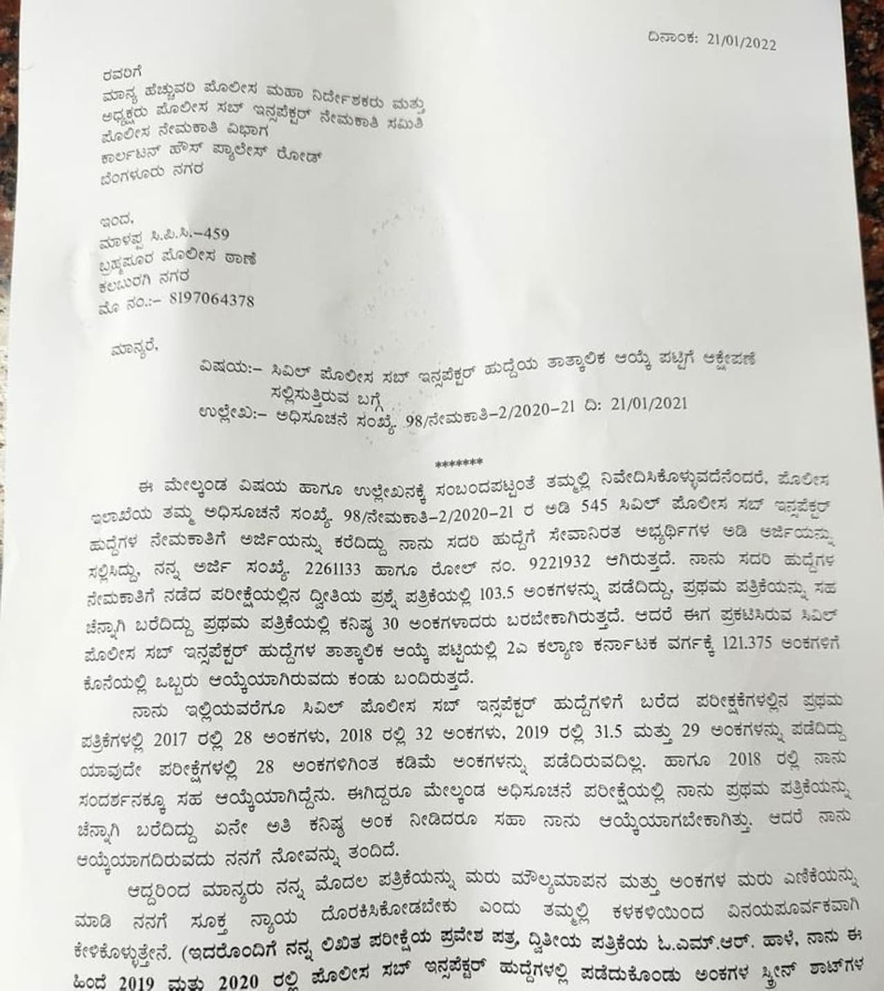 ಈ ಮಧ್ಯೆ ಸೇವಾ ನಿರತ (In Service) ಪ್ರತಿಭಾವಂತ ಅಭ್ಯರ್ಥಿಗಳೂ ಸಹ ಸಂಬಂಽತ ಮೇಲಧಿಕಾರಿಗಳಿಗೆ (ಎಡಿಜಿಪಿ-ನೇಮಕಾತಿ, ತರಬೇತಿ) ಮನವಿ ಪತ್ರ ಸಲ್ಲಿಸಿದ್ದು, ತಮ್ಮ ಉತ್ತರ ಪತ್ರಿಕೆಗಳ ಮರುಮೌಲ್ಯಮಾಪನ ಮಾಡಬೇಕೆಂದು ಕೋರಿದ್ದಾರೆ. ಪರೀಕ್ಷೆಗಳನ್ನು ಚೆನ್ನಾಗಿ ಬರೆದಿದ್ದರೂ ಆಯ್ಕೆಯಾಗದಿರುವುದು ನೋವು ಮೂಡಿಸಿದೆ ಎಂದು ಅಳಲು ತೋಡಿಕೊಂಡಿದ್ದಾರೆ.