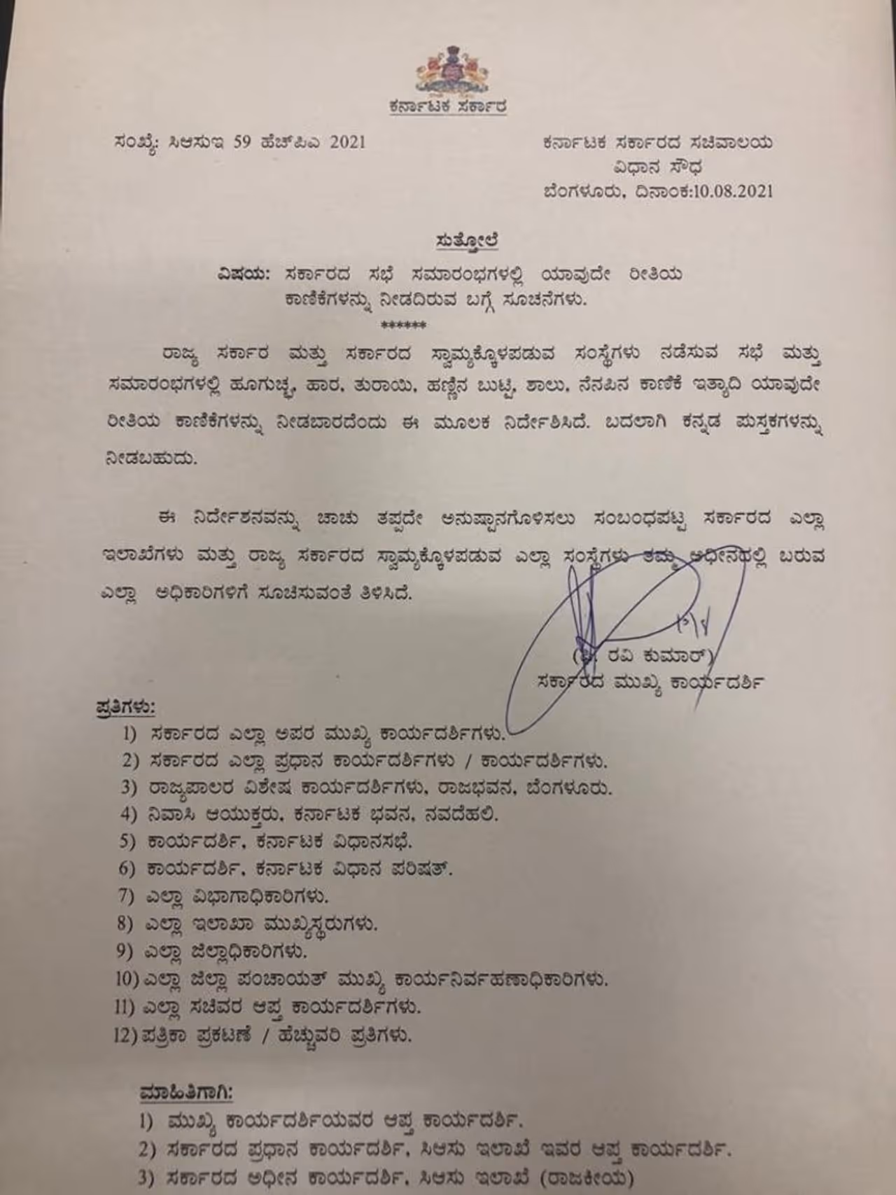 ಹೌದು ಮುಖ್ಯಮಂತ್ರಿಗಳ ಕಚೇರಿಯಿಂದ ಈ ಬಗ್ಗೆ ಪ್ರಕಟನೆಯೊಂದನ್ನು ಹೊರಡಿಸಲಾಗಿದ್ದು, ಇದರಲ್ಲಿ ರಾಜ್ಯ ಸರ್ಕಾರ ಮತ್ತು ಸರ್ಕಾರದ ಸ್ವಾಮ್ಯಕ್ಕೊಳಪಡುವ ಸಂಸ್ಥೆಗಳು ನಡೆಸುವ ಸಭೆ ಮತ್ತು ಸಮಾರಂಭಗಳಲ್ಲಿ ಹೂಗುಚ್ಛ, ಹಾರ, ತುರಾಯಿ, ಹಣ್ಣಿನ ಬುಟ್ಟಿ, ಶಾಲು, ನೆನಪಿನ ಕಾಣಿಕೆ ಇತ್ಯಾದಿ ಯಾವುದೇ ರೀತಿಯ ಕಾಣಿಕೆಗಳನ್ನು ನೀಡಬಾರದೆಂದು ಈ ಮೂಲಕ ನಿರ್ದೇಶಿಸಿದೆ. ಬದಲಾಗಿ ಕನ್ನಡ ಪುಸ್ತಕಗಳನ್ನು ನೀಡಬಹುದು ಎಂದು ಹೇಳಲಾಗಿದೆ.