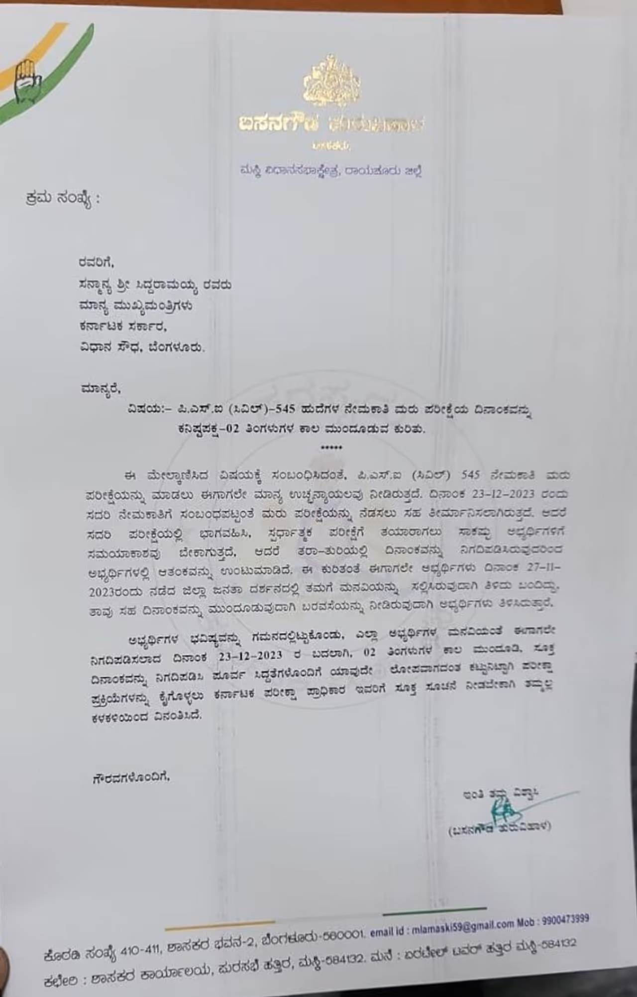 ಇನ್ನು ಮಸ್ಕಿ ವಿಧಾನಸಭಾ ಕ್ಷೇತ್ರದ ಶಾಸಕ ಬಸನಗೌಡ ತುರವಿಹಾಳ ಅವರು ಮುಖ್ಯಮಂತ್ರಿ ಸಿದ್ದರಾಮಯ್ಯ ಅವರಿಗೆ ಪತ್ರವನ್ನು ಬರೆದಿದ್ದು, ಪಿ.ಎಸ್.ಐ (ಸಿವಿಲ್ ) 545 ಹುದ್ದೆಗಳ ನೇಮಕಾತಿ ಮರು ಪರೀಕ್ಷೆಯ ದಿನಾಂಕವನ್ನು ಕನಿಷ್ಟ ಪಕ್ಷ-02 ತಿಂಗಳುಗಳ ಕಾಲ ಮುಂದೂಡಿಕೆ ಮಾಡಬೇಕು ಎಂದು ಮನವಿ ಮಾಡಿದ್ದಾರೆ. ಪಿ.ಎಸ್.ಐ (ಸಿವಿಲ್) 545 ನೇಮಕಾತಿ ಮರು ಪರೀಕ್ಷೆಯನ್ನು ಮಾಡಲು ಈಗಾಗಲೇ ಮಾನ್ಯ ಉಚ್ಚನ್ಯಾಯಲವು ಆದೇಶ ನೀಡಿರುತ್ತದೆ. 23-12-2023 ಪಿಎಸ್ಐ ನೇಮಕಾತಿಗೆ ಸಂಬಂಧಪಟ್ಟಂತೆ ಮರು ಪರೀಕ್ಷೆಯನ್ನು ನಡೆಸಲು ದಿನಾಂಕ ಘೋಷಣೆ ಮಾಡಲಾಗಿದೆ. ಆದರೆ, ಸದರಿ ಸ್ಪರ್ಧಾತ್ಮಕ ಪರೀಕ್ಷೆಗೆ ತಯಾರಾಗಲು ಆಭ್ಯರ್ಥಿಗಳಿಗೆ ಸಾಕಷ್ಟು ಸಮಯಾಕಾಶವು ಬೇಕಾಗುತ್ತದೆ. ಆದರೆ ತರಾ-ತುರಿಯಲ್ಲಿ ಪರೀಕ್ಷಾ ದಿನಾಂಕ ನಿಗದಿಪಡಿಸಿರುವುದರಿಂದ ಅಭ್ಯರ್ಥಿಗಳಲ್ಲಿ ಆತಂಕ ಉಂಟಾಗಿದೆ. ಈ ಕುರಿತಂತೆ ಈಗಾಗಲೇ ಅಭ್ಯರ್ಥಿಗಳು ದಿನಾಂಕ 27-11- 2023ರಂದು ನಡೆದ ಜಿಲ್ಲಾ ಜನತಾ ದರ್ಶನದಲ್ಲಿ ತಮಗೆ ಮನವಿಯನ್ನು ಸಲ್ಲಿಸಿದ್ದಾರೆ. ತಾವು ಸಹ ದಿನಾಂಕವನ್ನು ಮುಂದೂಡುವುದಾಗಿ ಭರವಸೆಯನ್ನು ನೀಡಿರುವುದಾಗಿ ಅಭ್ಯರ್ಥಿಗಳು ತಿಳಿಸಿರುತ್ತಾರೆ.