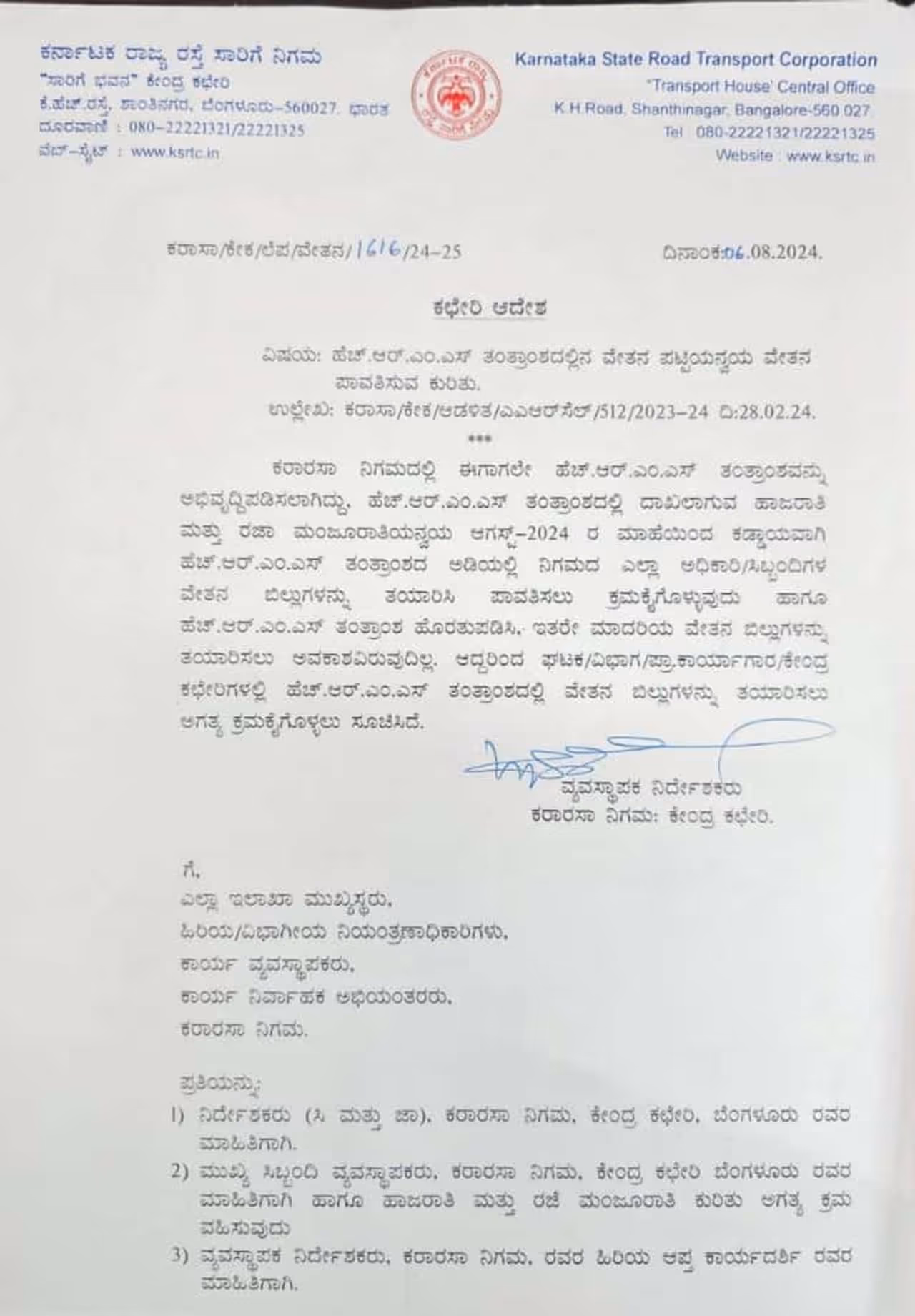 ಕೆಎಸ್ಆರ್ಟಿಸಿಯ ಎಲ್ಲ ನೌಕರರಿಗೆ ಆಗಸ್ಟ್ ತಿಂಗಳಿಂದ HRMS ತಂತ್ರಾಂಶದನ್ವಯ ವೇತನ ಪಾವತಿಸುವಂತೆ ಆದೇಶ ಹೊರಡಿಸಲಾಗಿದೆ. ಈ ಹೆಚ್ಆರ್ಎಂಎಸ್ ತಂತ್ರಾಂಶದಲ್ಲಿ ದಾಖಲಾಗುವ ಹಾಜರಾತಿ ಮತ್ತು ರಜೆ ಮಂಜೂರಾತಿಯನ್ವಯ ವೇತನ ಪಾವತಿ ಕಡ್ಡಾಯ. HRMS ವೇತನ ಹೊರತುಪಡಿಸಿ ಬೇರೆ ಮಾದರಿಯ ವೇತನ ಬಿಲ್ಲು ತಯಾರಿಸಲು ಅವಕಾಶವಿಲ್ಲ. ಹೆಚ್ಆರ್ಎಂಎಸ್ ಅಡಿಯಲ್ಲಿ ಸಂಬಳ ನೀಡುವಂತೆ 2020 ರಿಂದ ನೌಕರರು ಮಾಡುತ್ತಲೇ ಇದ್ದರು. ಈ ಹಿನ್ನೆಲೆಯಲ್ಲಿ ಬಹುದಿನಗಳ ನೌಕರರ ಬೆಡಿಕೆಯನ್ನು ಈಡೇರಿಸಲಾಗಿದೆ. ಆಗಸ್ಟ್ ತಿಂಗಳ ವೇತನದಿಂದಲೇ ಹೊಸ ತಂತ್ರಾಂಶದ ಮೂಲಕ ವೇತನ ನೀಡಲಾಗುತ್ತದೆ ಎಂದು ಕೆಎಸ್ಆರ್ಟಿಸಿ ಆದೇಶ ಹೊರಡಿಸಿದೆ.