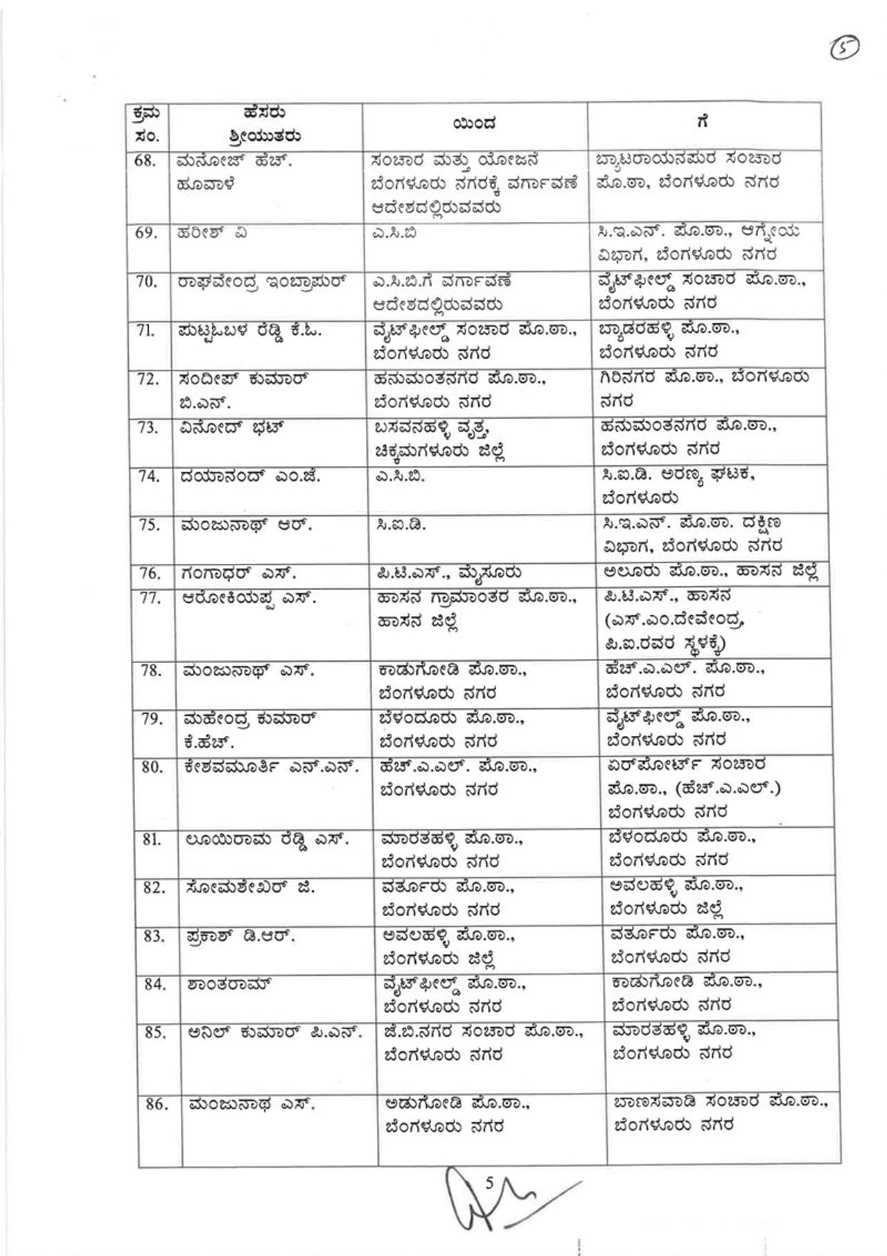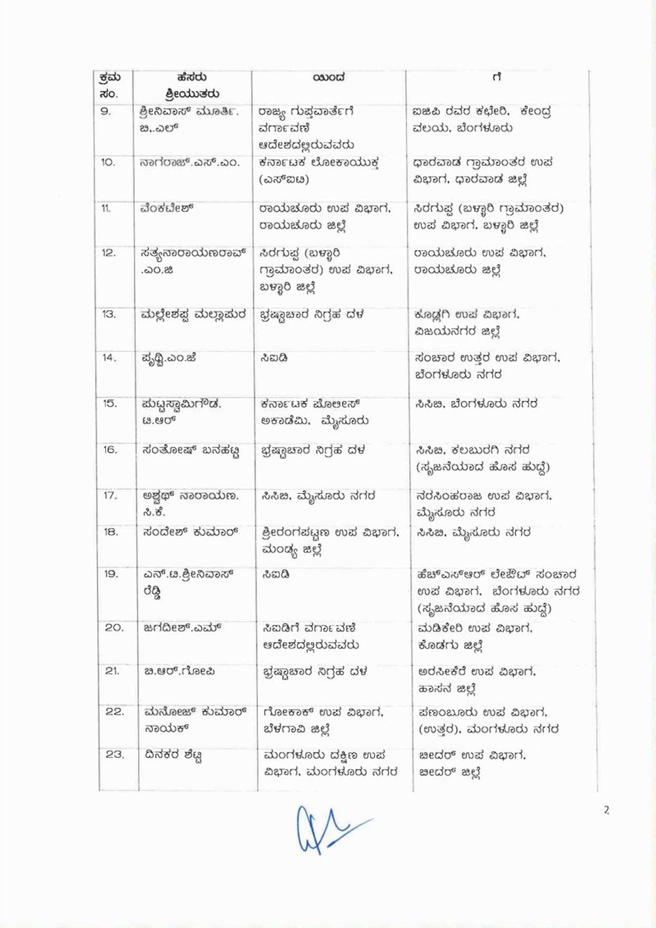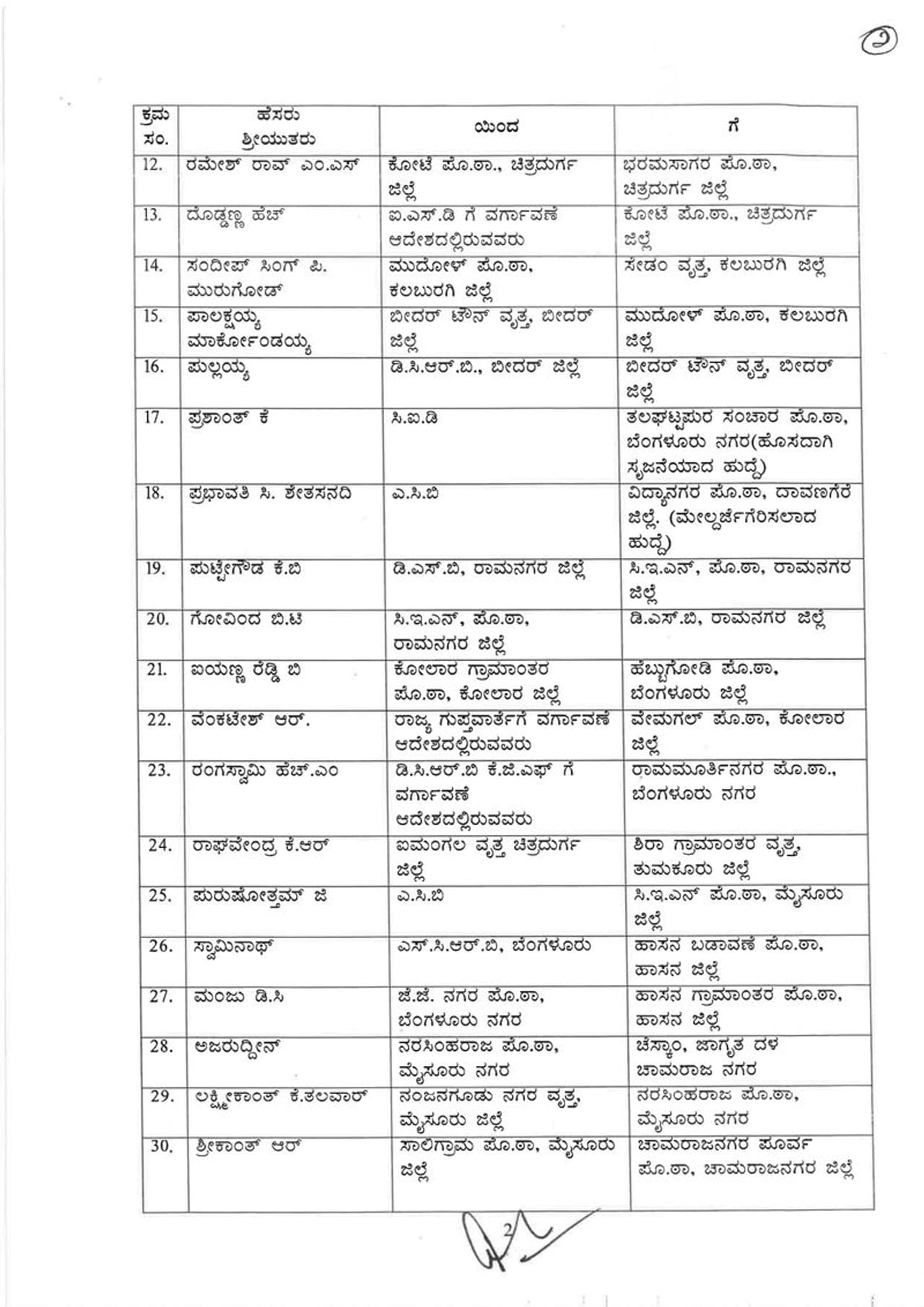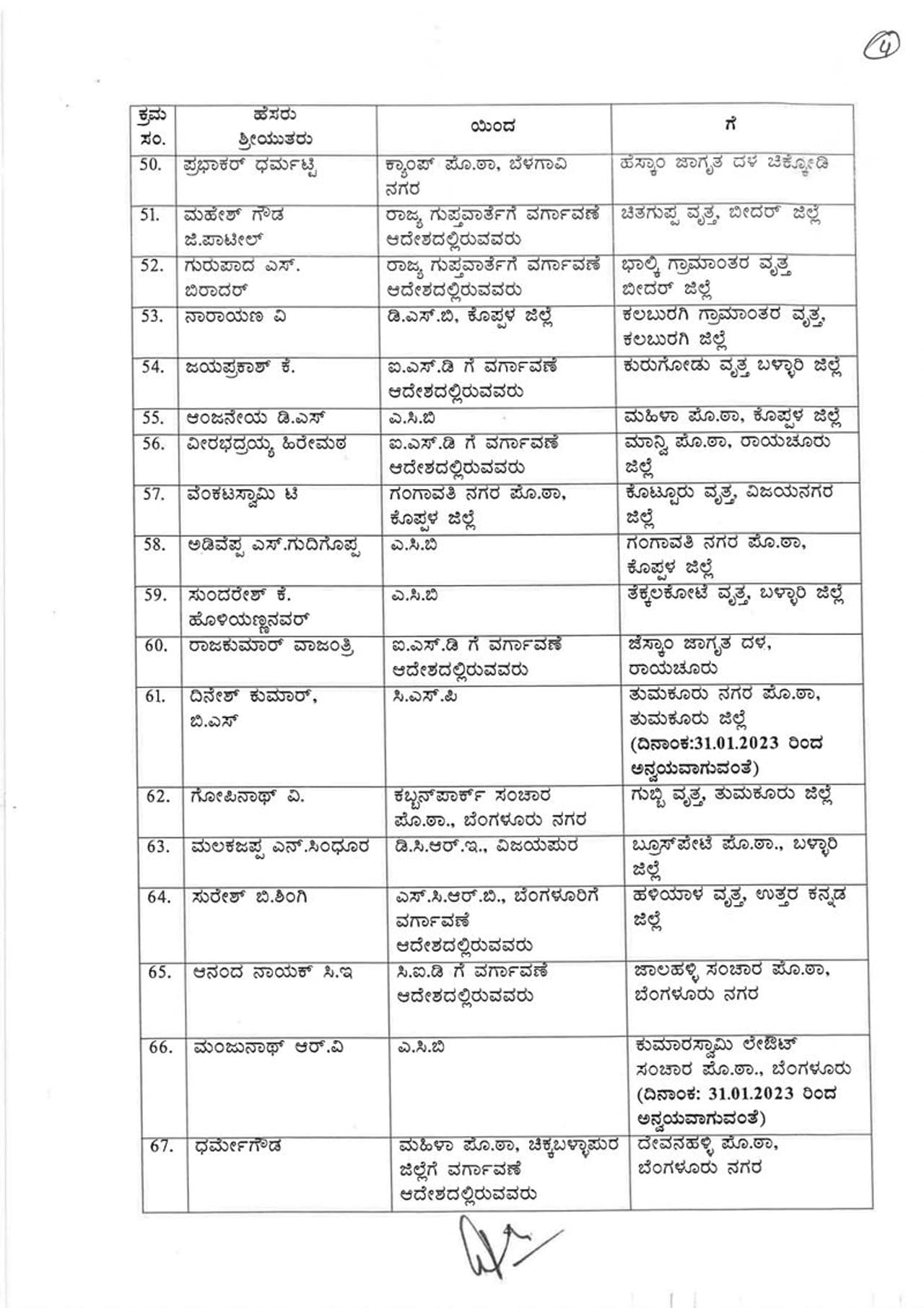 ವರ್ಗಾವಣೆಯ ಆದೇಶದಲ್ಲಿ ಸ್ಥಳ ನಿಯುಕ್ತಿಗೊಳಿಸದೇ ಇರುವ ಅಧಿಕಾರಿಗಳು ಮುಂದಿನ ಸೇವಾ ಸ್ಥಳ ನಿಯುಕ್ತಿಗಾಗಿ ಪೊಲೀಸ್ ಪ್ರಧಾನ ಕಚೇರಿಯಲ್ಲಿ ವರದಿ ಮಾಡಿಕೊಳ್ಳಬೇಕು ಎಂದು ಪ್ರಕಟಣೆಯಲ್ಲಿ ತಿಳಿಸಲಾಗಿದೆ.