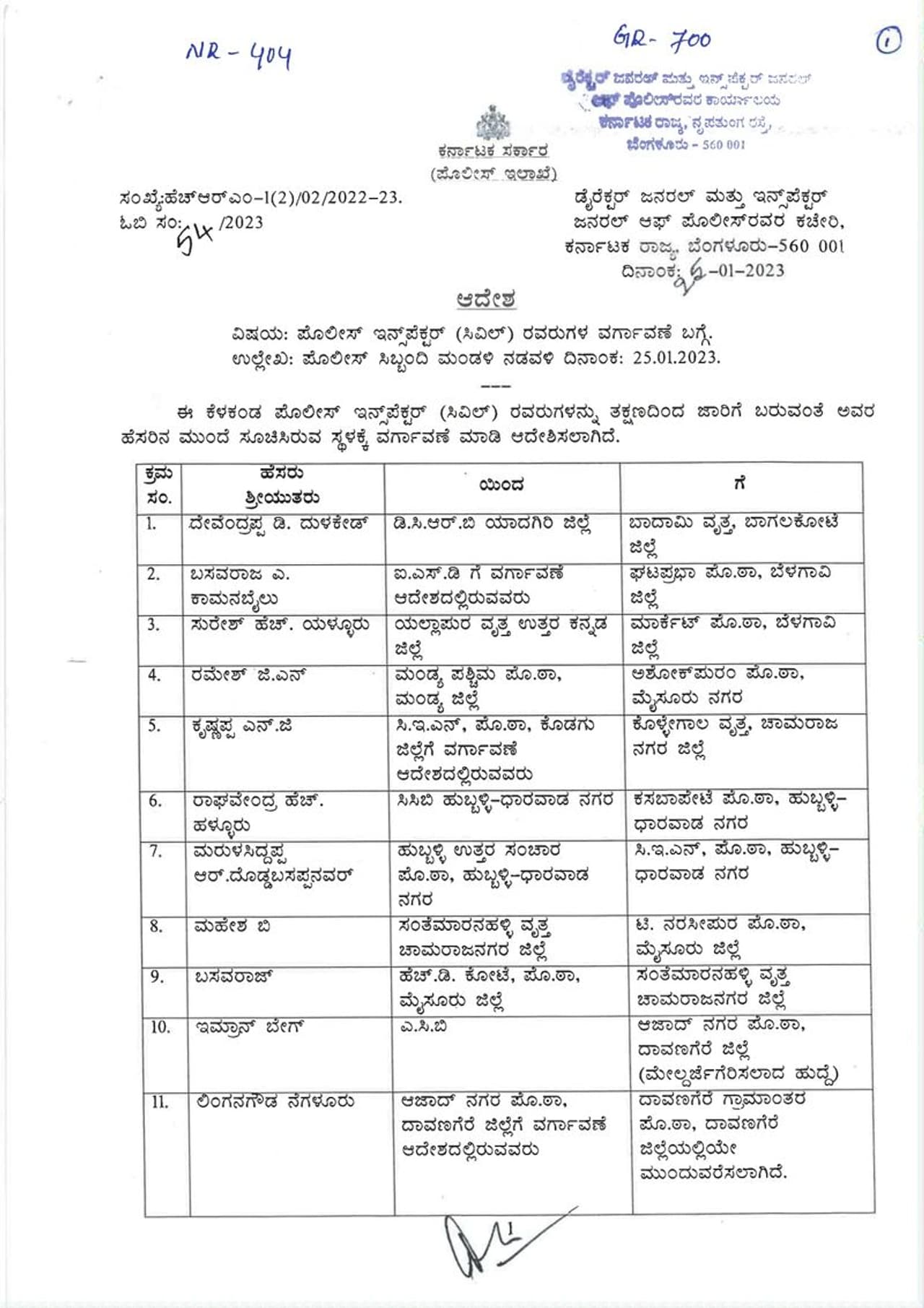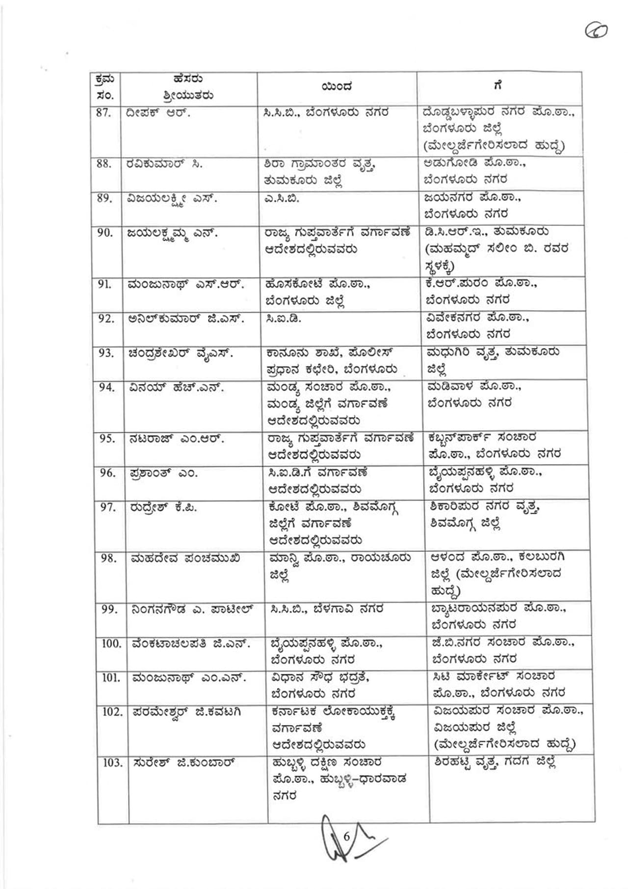 ವರ್ಗಾವಣೆಗೊಂಡಿರುವ 103 ಪೊಲೀಸ್ ಇನ್ಸ್ಪೆಕ್ಟರ್ಗಳು:
