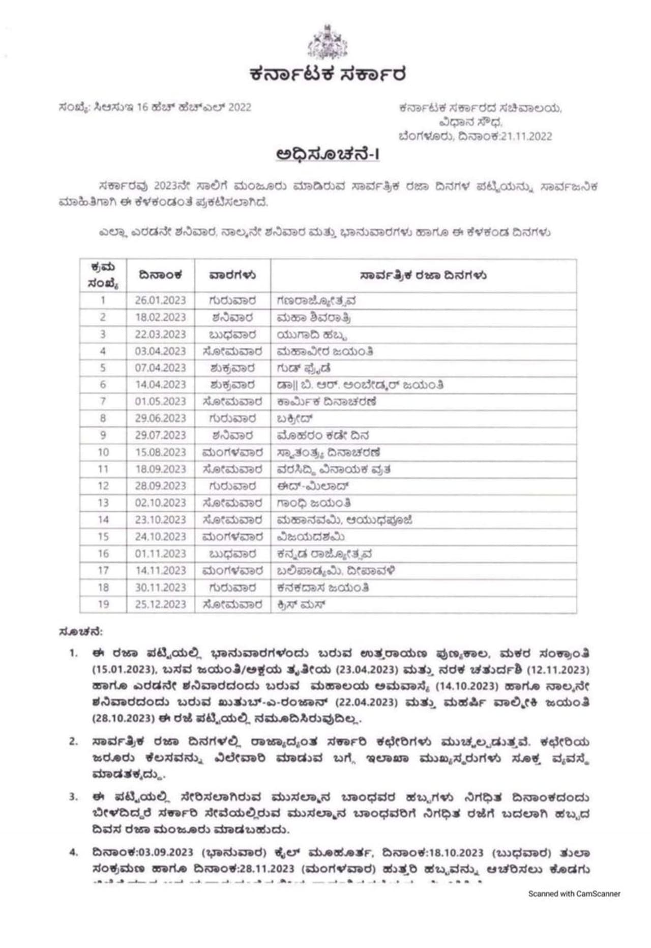 2023ನೇ ಸಾಲಿನ ಸಾರ್ವತ್ರಿಕ ರಜಾ ದಿನಗಳ ಪಟ್ಟಿಯನ್ನು (2023 Public Holidays List) ಕರ್ನಾಟಕ ಸರ್ಕಾರ (Karnataka Government) ಬಿಡುಗಡೆ ಮಾಡಿದೆ. ಸಾರ್ವಜನಿಕರ (Public) ಮಾಹಿತಿಗಾಗಿ ರಾಜ್ಯ ಸರ್ಕಾರ (State Government) ಈ ಮಾಹಿತಿಯನ್ನು ಪ್ರಕಟ ಮಾಡಿದೆ. 2ನೇ ಶನಿವಾರ, 4ನೇ ಶನಿವಾರ ಹಾಗೂ ಭಾನುವಾರದ ರಜಾ ದಿನಗಳನ್ನು ಹೊರತುಪಡಿಸಿ 203ರಲ್ಲಿ 19 ಸಾರ್ವತ್ರಿಕ ರಜಾ ದಿನಗಳನ್ನು ರಾಜ್ಯ ಸರ್ಕಾರ ನೀಡಿದೆ. ಈ ರಜಾ ದಿನಗಳಂದು ಸರ್ಕಾರಿ ಕಚೇರಿಗಳು (Government Offices) ಮುಚ್ಚಿರುತ್ತವೆ. ಹಾಗೂ, ಈ ಪಟ್ಟಿಯಲ್ಲಿ ಸೇರಿಸಿರುವ ಮುಸಲ್ಮಾನರ ಹಬ್ಬಗಳನ್ನು (Muslim Festivals) ನಿಗದಿತ ದಿನಾಂಕಗಳು ಬೀಳದಿದ್ದರೆ ಹಬ್ಬದ ದಿನದಂದೇ ಮುಸಲ್ಮಾನ ಸರ್ಕಾರಿ ಅಧಿಕಾರಿಗೆ ರಜೆ ನೀಡಬೇಕೆಂದೂ ಸೂಚನೆ ನೀಡಲಾಗಿದೆ.