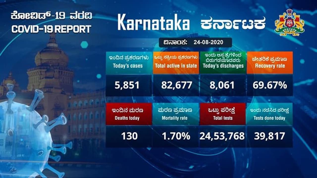 ಬೆಂಗಳೂರು, (ಆ.24): ರಾಜ್ಯದಲ್ಲಿ ಇಂದು (ಸೋಮವಾರ) 5,851 ಮಂದಿ ಕೊರೋನಾ ಪಾಸಿಟಿವ್ ಕೇಸ್ ಪತ್ತಯಾಗಿದ್ದು, 130 ಮಂದಿ ಸೋಂಕಿನಿಂದ ಸಾವನ್ನಪ್ಪಿದ್ದಾರೆ.