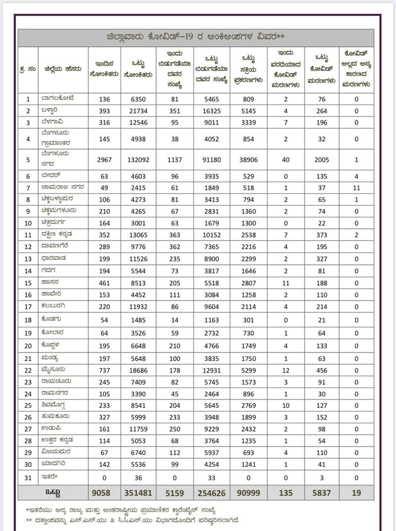 ರಾಜ್ಯದಲ್ಲಿ ಒಟ್ಟು ಸೋಂಕಿತರ ಸಂಖ್ಯೆ 3,51,481 ಕ್ಕೆ ಏರಿಕೆಯಾಗಿದ್ದು, 5837 ಜನ ಸಾವನ್ನಪ್ಪಿದ್ದಾರೆ. ಇನ್ನು ಪ್ರಸ್ತುತ 90999 ಸಕ್ರಿಯ ಪ್ರಕರಣಗಳಿವೆ. ಈ ಪೈಕಿ 762 ಜನ ಐಸಿಯುನಲ್ಲಿ ಚಿಕಿತ್ಸೆ ಪಡೆಯುತ್ತಿದ್ದಾರೆ.