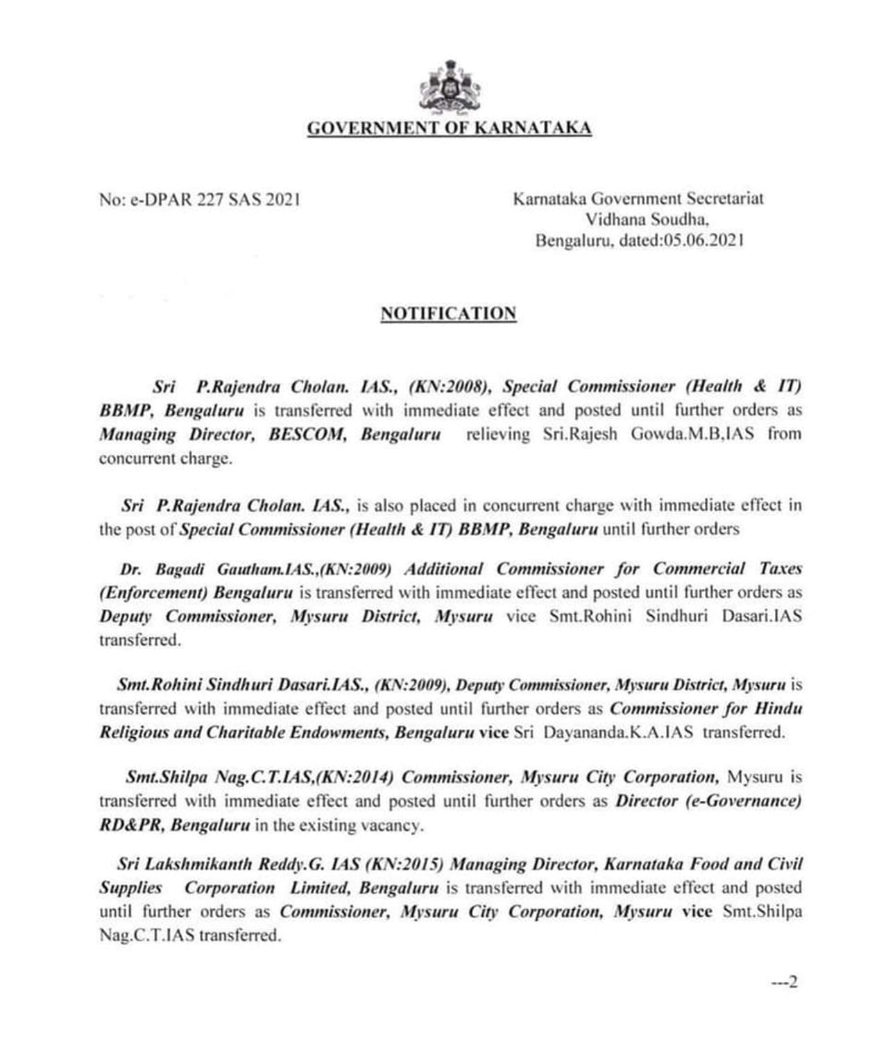 ರೋಹಿಣಿ ಸಿಂಧೂರಿ ಅವರನ್ನು ಹಿಂದೂ ಧಾರ್ಮಿಕ ದತ್ತಿ ಇಲಾಖೆ ಆಯುಕ್ತರನ್ನಾಗಿ ನೇಮಿಸಿ ವರ್ಗಾವಣೆ ಮಾಡಲಾಗಿದೆ. ಶಿಲ್ಪಾ ನಾಗ್ ಅವರನ್ನು ಸಿಬ್ಬಂದಿ ಮತ್ತು ಆಡಳಿತ ಸುಧಾರಣೆ ಇಲಾಖೆಯ ಇ-ಆಡಳಿತ ವಿಭಾಗದ ನಿರ್ದೇಶಕರ್ನಾಗಿ ನೇಮಿಸಿ ವರ್ಗಾಯಿಸಲಾಗಿದೆ.