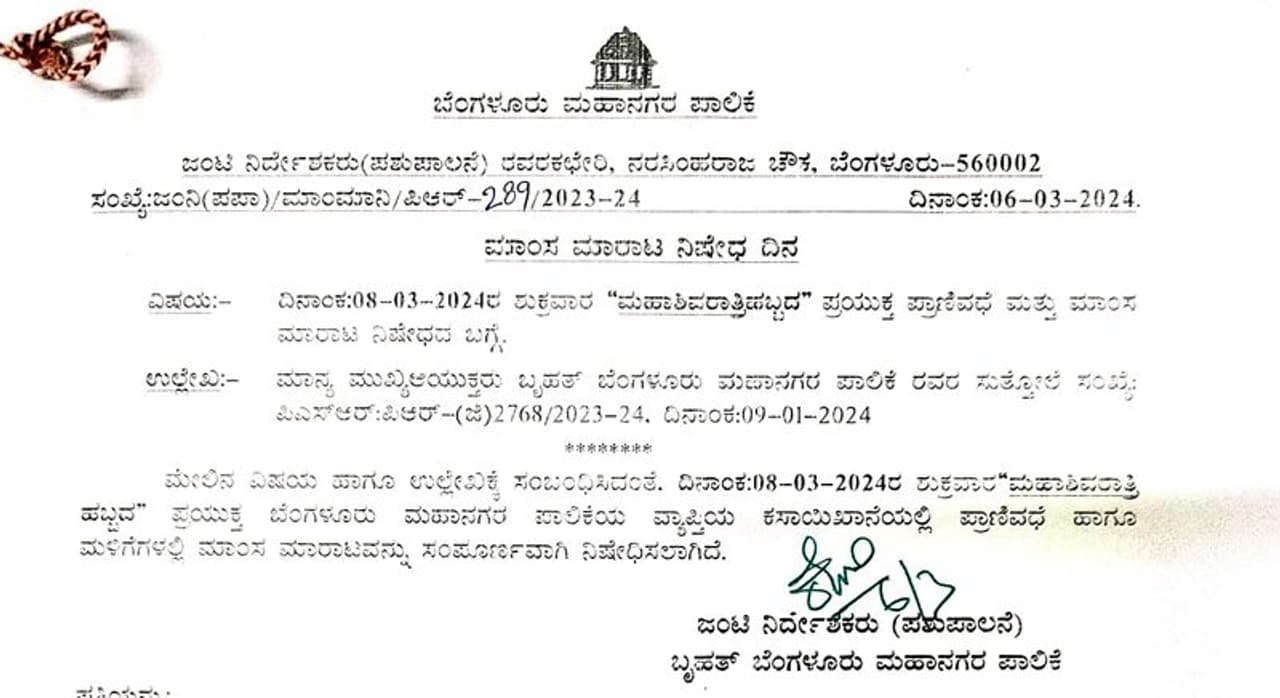 ಮಹಿಳಾ ದಿನಾಚರಣೆ ದಿನವೇ ಇಡೀ ಬೆಂಗಳೂರು ನಗರದಾದ್ಯಂತ ಪ್ರಾಣಿವಧೆ ಹಾಗೂ ಮಾಂಸ ಮಾರಾಟವನ್ನು ನಿಷೇಧಿಸಿ ಬಿಬಿಎಂಪಿ ಆದೇಶ ಹೊರಡಿಸಿದೆ.