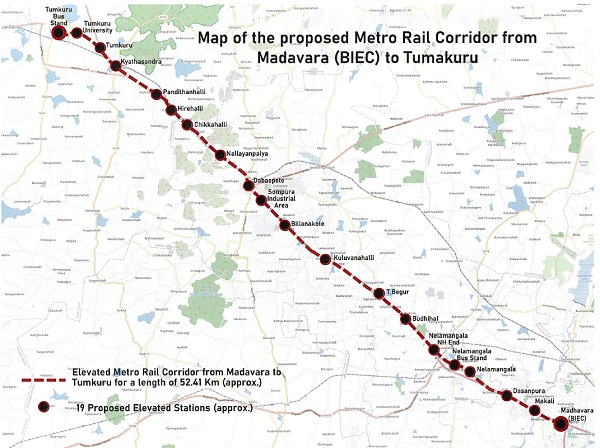 ಈ ಮಾರ್ಗದಲ್ಲಿ 25 ಎಲೆವೇಟೆಡ್ ನಿಲ್ದಾಣಗಳ ನಿರ್ಮಾಣವೂ ಯೋಜನೆಗಳಲ್ಲಿ ಸೇರಿದೆ. ಬೆಂಗಳೂರಿನ ಹಸಿರು ಮಾರ್ಗದಲ್ಲಿರುವ ಮಾದವರ (BIEC) ನಿಲ್ದಾಣದಿಂದ ಮೆಟ್ರೋ ಮಾರ್ಗವು ಪ್ರಾರಂಭವಾಗಿ ತುಮಕೂರಿನ ಶಿರಾ ಗೇಟ್ ವರೆಗೆ ವಿಸ್ತರಿಸಲಿದೆ ಎಂದು ವರದಿಗಳು ತಿಳಿಸಿವೆ. ಮುಂದಿನ ಕ್ರಮಕ್ಕಾಗಿ ಕಾರ್ಯಸಾಧ್ಯತಾ ಅಧ್ಯಯನ ವರದಿಯನ್ನು ಸರ್ಕಾರಕ್ಕೆ ಹಸ್ತಾಂತರಿಸಲಾಗಿದೆ ಎಂದು BMRCL ನ ಮುಖ್ಯ ಸಾರ್ವಜನಿಕ ಸಂಪರ್ಕ ಅಧಿಕಾರಿ ಯಶವಂತ್ ಚೌಹಾಣ್ ದೃಢಪಡಿಸಿದ್ದಾರೆ.