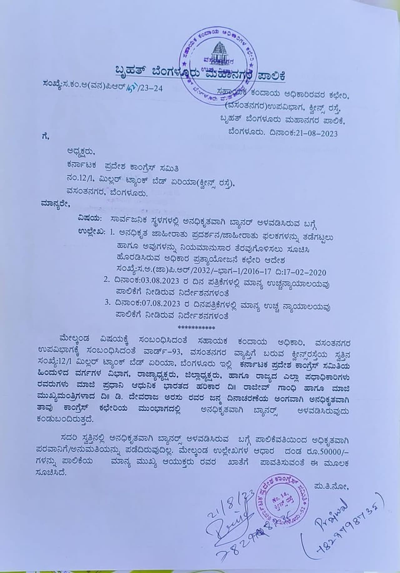 ಸದರಿ ಸ್ವತ್ತಿನಲ್ಲಿ ಅನಧಿಕೃತವಾಗಿ ಬ್ಯಾನರ್ ಅಳವಡಿಸಿರುವ ಬಗ್ಗೆ ಪಾಲಿಕೆವತಿಯಿಂದ ಅಧಿಕೃತವಾಗಿ ಪರವಾನಿಗೆ/ಅನುಮತಿಯನ್ನು ಪಡೆದಿರುವುದಿಲ್ಲ. ಈ ಸಂಬಂಧ ಅಧ್ಯಕ್ಷರು, ಕರ್ನಾಟಕ ಪ್ರದೇಶ ಕಾಂಗ್ರೆಸ್ ಸಮಿತಿ, ಬೆಂಗಳೂರು ರವರಿಗೆ 50,000/- ರೂ.ಗಳ ದಂಡವನ್ನು ವಿಧಿಸಲಾಗಿದ್ದು, ಮಾನ್ಯ ಮುಖ್ಯ ಆಯುಕ್ತರು ರವರ ಖಾತೆಗೆ ದಂಡದ ಮೊತ್ತ ಪಾವತಿಸುವಂತೆ ಸೂಚಿಸಲಾಗಿರುತ್ತದೆ.