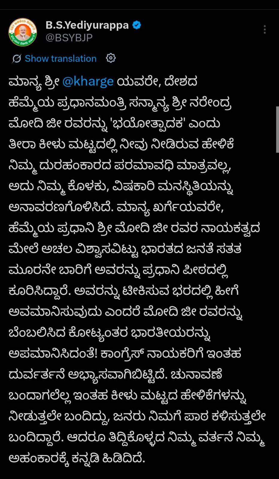 ಮಾನ್ಯ ಶ್ರೀ ಖರ್ಗೆಯವರೇ, ದೇಶದ ಹೆಮ್ಮೆಯ ಪ್ರಧಾನಮಂತ್ರಿ ಸನ್ಮಾನ್ಯ ಶ್ರೀ ನರೇಂದ್ರ ಮೋದಿ ಜೀ ರವರನ್ನು 'ಭಯೋತ್ಪಾದಕ' ಎಂದು ತೀರಾ ಕೀಳು ಮಟ್ಟದಲ್ಲಿ ನೀವು ನೀಡಿರುವ ಹೇಳಿಕೆ ನಿಮ್ಮ ದುರಹಂಕಾರದ ಪರಮಾವಧಿ ಮಾತ್ರವಲ್ಲ, ಅದು ನಿಮ್ಮ ಕೊಳಕು, ವಿಷಕಾರಿ ಮನಸ್ಥಿತಿಯನ್ನು ಅನಾವರಣಗೊಳಿಸಿದೆ. ಮಾನ್ಯ ಖರ್ಗೆಯವರೇ, ಹೆಮ್ಮೆಯ ಪ್ರಧಾನಿ ಶ್ರೀ ಮೋದಿ ಜೀ ರವರ ನಾಯಕತ್ವದ ಮೇಲೆ ಅಚಲ ವಿಶ್ವಾಸವಿಟ್ಟು ಭಾರತದ ಜನತೆ ಸತತ ಮೂರನೇ ಬಾರಿಗೆ ಅವರನ್ನು ಪ್ರಧಾನಿ ಪೀಠದಲ್ಲಿ ಕೂರಿಸಿದ್ದಾರೆ. ಅವರನ್ನು ಟೀಕಿಸುವ ಭರದಲ್ಲಿ ಹೀಗೆ ಅವಮಾನಿಸುವುದು ಎಂದರೆ ಮೋದಿ ಜೀ ರವರನ್ನು ಬೆಂಬಲಿಸಿದ ಕೋಟ್ಯಂತರ ಭಾರತೀಯರನ್ನು ಅಪಮಾನಿಸಿದಂತೆ! ಕಾಂಗ್ರೆಸ್ ನಾಯಕರಿಗೆ ಇಂತಹ ದುರ್ವರ್ತನೆ ಅಭ್ಯಾಸವಾಗಿಬಿಟ್ಟಿದೆ. ಚುನಾವಣೆ ಬಂದಾಗಲೆಲ್ಲ ಇಂತಹ ಕೀಳು ಮಟ್ಟದ ಹೇಳಿಕೆಗಳನ್ನು ನೀಡುತ್ತಲೇ ಬಂದಿದ್ದು, ಜನರು ನಿಮಗೆ ಪಾಠ ಕಳಿಸುತ್ತಲೇ ಬಂದಿದ್ದಾರೆ. ಆದರೂ ತಿದ್ದಿಕೊಳ್ಳದ ನಿಮ್ಮ ವರ್ತನೆ ನಿಮ್ಮ ಅಹಂಕಾರಕ್ಕೆ ಕನ್ನಡಿ ಹಿಡಿದಿದೆ.
