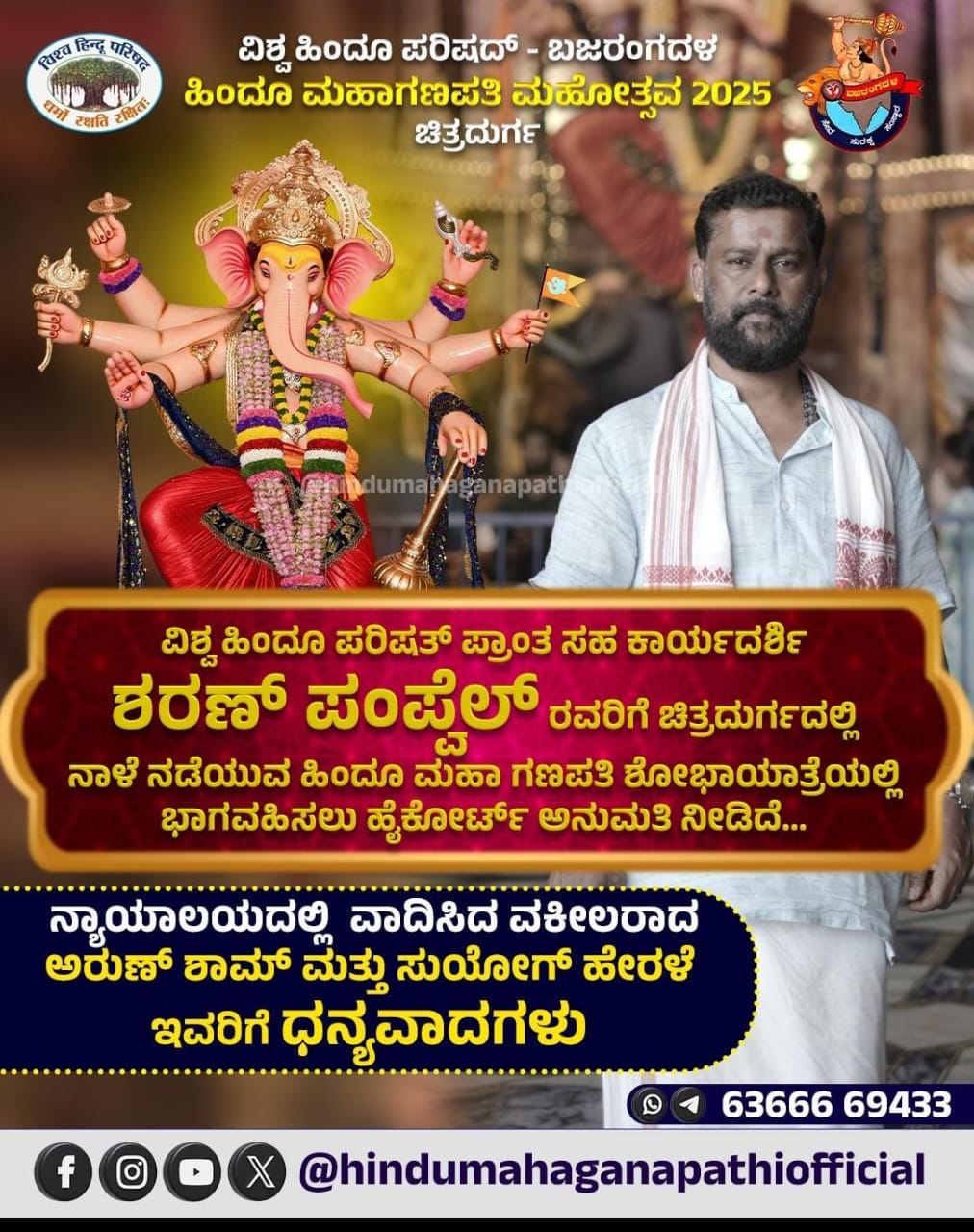 ವಿಶ್ವ ಹಿಂದೂ ಪರಿಷತ್ (ವಿಹಿಂಪ) ಸಹ ಕಾರ್ಯದರ್ಶಿ ಶರಣ್ ಪಂಪ್ವೆಲ್ ಅವರಿಗೆ ಜಿಲ್ಲಾಡಳಿತ ಜಿಲ್ಲೆ ಪ್ರವೇಶ ನಿರ್ಬಂಧ ಹೇರಿತ್ತು. ಈ ನಿರ್ಬಂಧ ಆದೇಶವನ್ನು ತೆರವುಗೊಳಿಸಲು ಅವರು ಹೈಕೋರ್ಟ್ನಲ್ಲಿ ಮೊರೆ ಹೋಗಿದ್ದರು. ಇಂದು ಶೋಭಾಯಾತ್ರೆಯಲ್ಲಿ ಭಾಗಿಯಾಗಲು ಹೈಕೋರ್ಟ್ ಅನುಮತಿ ನೀಡಿದ್ದು, ಶರಣ್ ಪಂಪ್ವೆಲ್ ಆಗಮಿಸುತ್ತಿದ್ದಾರೆ. ಈ ಬೆಳವಣಿಗೆಯು ಸ್ಥಳೀಯ ರಾಜಕೀಯ ಹಾಗೂ ಧಾರ್ಮಿಕ ವಲಯಗಳಲ್ಲಿ ಚರ್ಚೆಗೆ ಗುರಿಯಾಗಿದೆ. ಈ ಶೋಭಾಯಾತ್ರೆಯ ಮೂಲಕ ಚಿತ್ರದುರ್ಗದಲ್ಲಿ ಗಣೇಶೋತ್ಸವದ ಸಂಭ್ರಮದ ಕ್ಷಣಕ್ಕೆ ಕ್ಷಣಗಣನೆ ಆರಂಭವಾಗಿದೆ. ಮುಂದಿನ ಅಪ್ಡೇಟ್ಗಳಿಗಾಗಿ ಕಾಯುತ್ತಿರಿ..