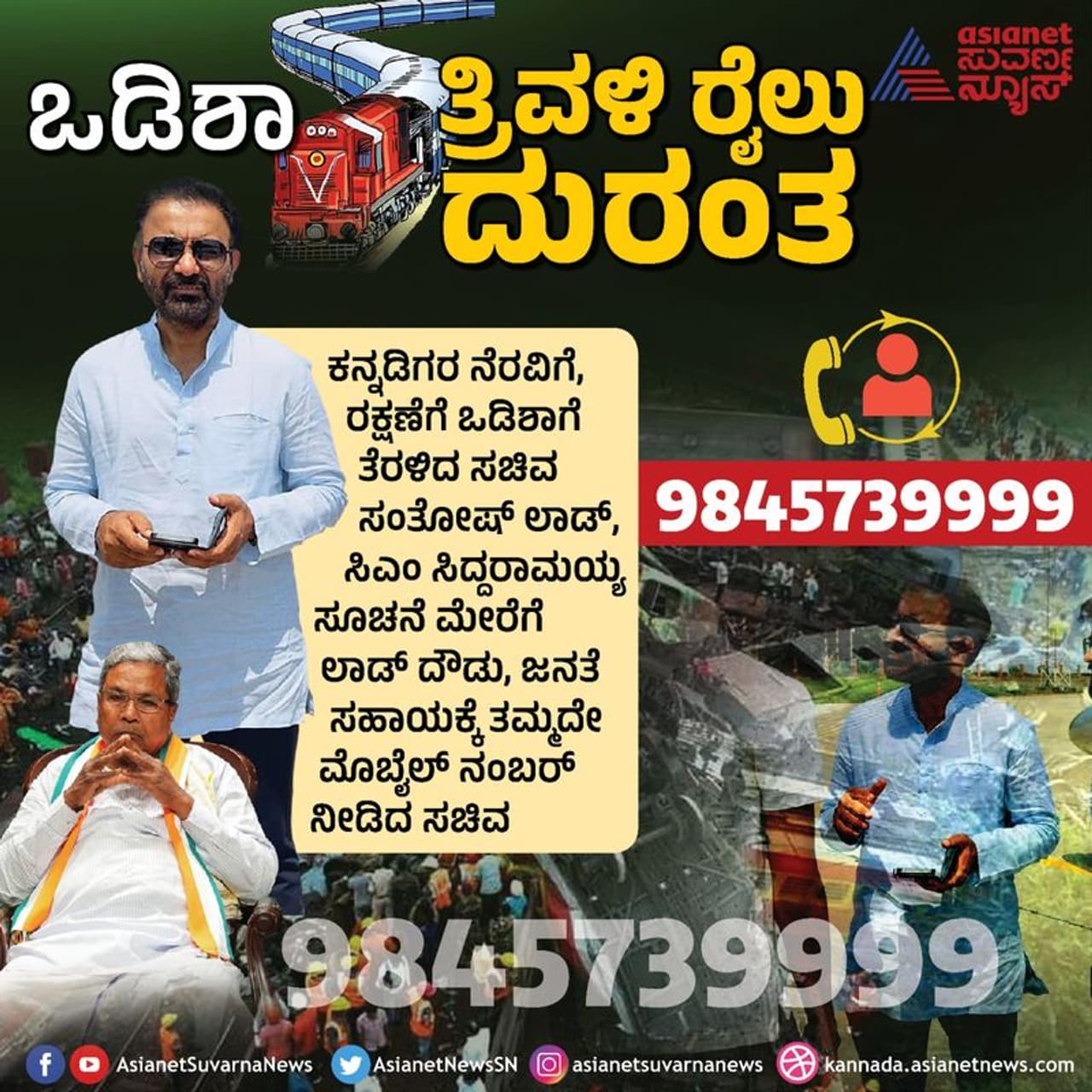 ಒಡಿಶಾದ ಬಾಲಸೋರ್ ನಲ್ಲಿ ಸಂಭವಿಸಿದ ರೈಲು ದುರಂತದ ಹಿನ್ನೆಲೆಯಲ್ಲಿ ಕನ್ನಡಿಗರ ಸುರಕ್ಷತೆ ಬಗ್ಗೆ ಗಮನ ಹರಿಸಲು ಕಾರ್ಮಿಕ ಸಚಿವ ಸಂತೋಷ್ ಲಾಡ್ ಅವರನ್ನು ಮುಖ್ಯಮಂತ್ರಿ ಸಿದ್ದರಾಮಯ್ಯ ನಿಯೋಜಿಸಿದ್ದಾರೆ. ಘಟನೆ ಕುರಿತಾಗಿ ಸರ್ಕಾರದ ಮುಖ್ಯ ಕಾರ್ಯದರ್ಶಿ ಅವರಿಂದ ವರದಿ ಕೇಳಿದ ಬಳಿಕ ಸಂಬಂಧಪಟ್ಟ ಹಿರಿಯ ಅಧಿಕಾರಿಗಳೊಂದಿಗೆ ಚರ್ಚೆ ನಡೆಸಿ, ಬಳಿಕ ತಕ್ಷಣ ಸ್ಥಳಕ್ಕೆ ತೆರಳಿ ಕನ್ನಡಿಗರ ಸುರಕ್ಷತೆ ಬಗ್ಗೆ ಗಮನ ಹರಿಸಲು ಹಾಗೂ ಅಗತ್ಯ ನೆರವನ್ನು ಒದಗಿಸಲು ಸೂಚನೆ ನೀಡಿದ್ದಾರೆ. ಸಂತೋಷ್ ಲಾಡ್ ಅವರ ಜತೆಗೆ ವಿಪತ್ತು ನಿರ್ವಹಣಾ ಪ್ರಾಧಿಕಾರದ ಆಯುಕ್ತ ಮನೋಜ್ ರಾಜನ್ ಸೇರಿ ಇತರೆ ಅಧಿಕಾರಿಗಳ ತಂಡ ಘಟನಾ ಸ್ಥಳಕ್ಕೆ ಹೊರಟಿದೆ. ಹೆಚ್ ಎಎಲ್ ವಿಮಾನ ನಿಲ್ದಾಣದಿಂದ ಸಂತೋಷ್ ಲಾಡ್ ಪ್ರಯಾಣ ಬೆಳಸಿದ್ದು, ತನ್ನದೇ ನಂಬರ್ ಅನ್ನು ಸಹಾಯಕ್ಕಾಗಿ ನೀಡಿದ್ದಾರೆ.