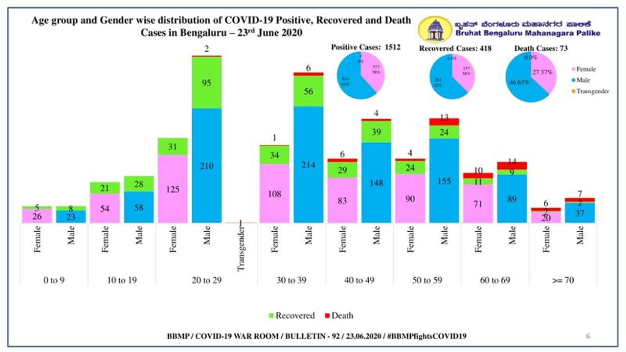 ಇನ್ನು ಚಿಕಿತ್ಸೆ ಫಲಕಾರಿಯಾಗದೆ ಸಾವನ್ನಪ್ಪಿದವರಲ್ಲೂ ಕೂಡ ಪುರುಷರೇ ಹೆಚ್ಚಾಗಿದ್ದಾ ಎಂದು ತಿಳಿದು ಬಂದಿದೆ. ಈವರೆಗೂ ಬೆಂಗಳೂರಿನ್ಲಲಿ ಮಹಾಮಾರಿ ಕೊರೋನಾಗೆ ಒಟ್ಟು 73 ಜನ ಸಾವನ್ನಪ್ಪಿದ್ದಾರೆ. ಅದರಲ್ಲಿ 46 ಮಂದಿ ಪುರುಷರು, 27 ಮಂದಿ ಮಹಿಳೆಯರಾಗಿದ್ದಾರೆ. 50 ರಿಂದ 70 ವರ್ಷದ ವಯೋಮಾನದವರು ಒಟ್ಟು 27 ಜನ ಕೊರೋನಾಗೆ ಜೀವತೆತ್ತಿದ್ದಾರೆ.