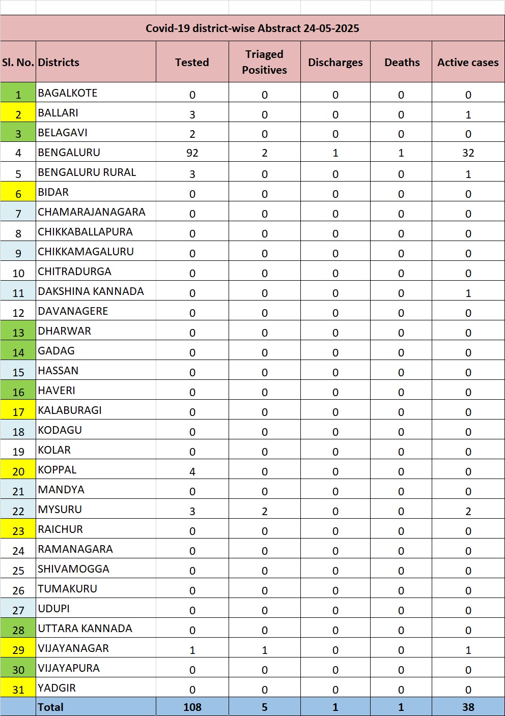 ಬೆಂಗಳೂರು (ಮೇ.24): ರಾಜ್ಯದಲ್ಲಿ ಕೋವಿಡ್-19 ಪ್ರಕರಣಗಳು ಮತ್ತೆ ಏರಿಕೆ ಕಾಣುತ್ತಿದ್ದು, ಇಂದು ಹೊಸದಾಗಿ 5 ಪಾಸಿಟಿವ್ ಕೇಸ್ಗಳು ದಾಖಲಾಗಿವೆ. ಈ ಪೈಕಿ ಬೆಂಗಳೂರಿನಲ್ಲಿ 32 ಸಕ್ರಿಯ ಪ್ರಕರಣಗಳು ದೃಢಪಟ್ಟಿದ್ದು, ಬೆಂಗಳೂರು ಗ್ರಾಮಾಂತರದಲ್ಲಿ ಒಂದು ಕೇಸ್ ವರದಿಯಾಗಿದೆ. ಒಟ್ಟಾರೆ ರಾಜ್ಯದಲ್ಲಿ ಸಕ್ರಿಯ ಪ್ರಕರಣಗಳ ಸಂಖ್ಯೆ 38ಕ್ಕೆ ಏರಿಕೆಯಾಗಿದೆ.