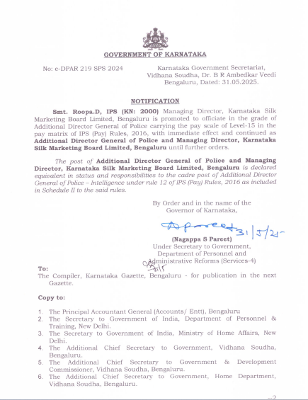 ರೋಹಿಣಿ ಸಿಂಧೂರಿಯವರ ವಿಚಾರದಲ್ಲಿ ಸೃಷ್ಟಿಯಾದ ಗೊಂದಲದಲ್ಲಿ ಡಿ ರೂಪಾ ಶಿಸ್ತು ಕ್ರಮವನ್ನು ಎದುರಿಸಿದ್ದರು. ಮಾರ್ಚ್ನಲ್ಲಿ ತಮ್ಮ ಕ್ಯಾಬಿನ್ನಲ್ಲಿ ಫೈಲ್ ಇಟ್ಟು ಸಿಕ್ಕಿಹಾಕಿಸಲು ಪ್ರಯತ್ನಿಸಿದ್ದಾರೆ ಎಂದು ವರ್ತಿಕಾ ಕಟಿಯಾರ್ ಐಪಿಎಸ್ ಡಿ. ರೂಪ ವಿರುದ್ಧ ದೂರು ನೀಡಿದ್ದರು. ಈ ದೂರಿನ ಹಿನ್ನೆಲೆಯಲ್ಲಿ ಡಿ ರೂಪ ಅವರನ್ನು ಗುಪ್ತಚರ ವಿಭಾಗದಿಂದ ವರ್ಗಾವಣೆ ಮಾಡಲಾಗಿತ್ತು. ಇತ್ತ ಕಾನೂನು ಸಮರ ಮುಂದುವರಿತ್ತು. ಇದೀಗ ಕೋರ್ಟ್ ಮಹತ್ವ ಆದೇಶ ನೀಡಿದೆ. ಕೋರ್ಟ್ ಆದೇಶಕ್ಕೆ ಮಣಿದ ಸರ್ಕಾರ ಮುಂಬಡ್ತಿ ನೀಡಿದೆ. ಈ ಕುರಿತು ಸರ್ಕಾರ ಅಧಿಕೃತ ಆದೇಶ ಹೊರಡಿಸಿದೆ.