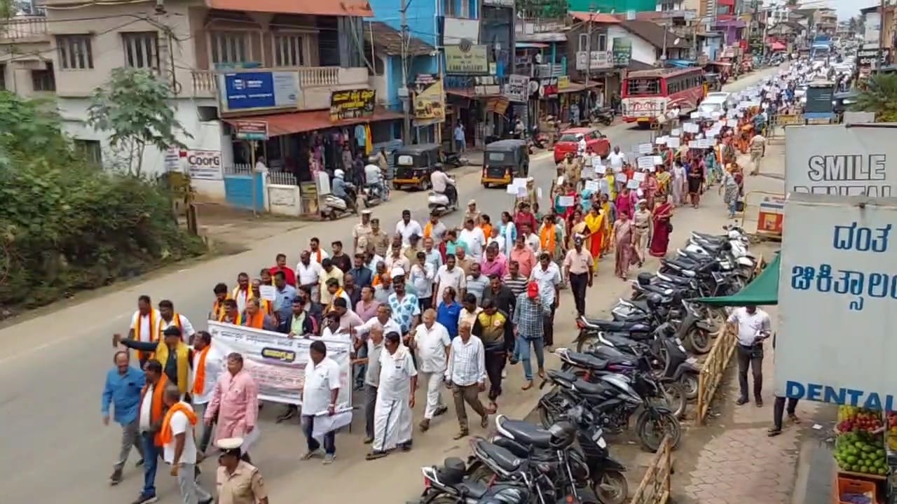 ಕೊಡಗು (ಆ.21): ಧರ್ಮಸ್ಥಳದ ವಿರುದ್ಧ ಅಪಪ್ರಚಾರ ನಡೆಸುತ್ತಿರುವವರನ್ನು ಕೂಡಲೇ ಬಂಧಿಸಿ ಕಾನೂನು ರೀತಿ ಕಠಿಣ ಕ್ರಮ ಕೈಗೊಳ್ಳುವಂತೆ ಆಗ್ರಹಿಸಿ ಕೊಡಗು ಜಿಲ್ಲೆಯ ಕುಶಾಲನಗರದಲ್ಲಿ ಬೃಹತ್ ಪ್ರತಿಭಟನೆ ನಡೆಯಿತು. ಹಿಂದೂಪರ ಸಂಘಟನೆಗಳ ಹಾಗೂ ವಿವಿಧ ಸಂಘ ಸಂಸ್ಥೆಗಳ ನೇತೃತ್ವದಲ್ಲಿ ಕುಶಾಲನಗರದ ಮಾರಿಯಮ್ಮ ದೇವಾಲಯದ ಬಳಿಯಿಂದ ಬೃಹತ್ ಮೆರವಣಿಗೆ ಆರಂಭಿಸಿದರು. ಮಾರಿಯಮ್ಮ ದೇವಾಲಯದ ಬಳಿಯಿಂದ ಹೊರಟು ಬಿಎಂ ರಸ್ತೆಯಲ್ಲಿ ಒಂದುವರೆ ಕಿಲೋ ಮೀಟರ್ ಗೂ ಹೆಚ್ಚು ದೂರು ಪ್ರತಿಭಟನಾ ಮೆರವಣಿಗೆ ನಡೆಸಿದರು. ಬಳಿಕ ಕೆಎಸ್ಆರ್ಟಿಸಿ ಬಸ್ಸು ನಿಲ್ದಾಣದ ಮುಂಭಾಗದಲ್ಲೇ ಇರುವ ಮಾರ್ಷಲ್ ಕಾರ್ಯಪ್ಪ ವೃತ್ತದಲ್ಲಿ ಒಂದು ಗಂಟೆಗೂ ಹೆಚ್ಚು ಸಮಯ ಪ್ರತಿಭಟನೆ ನಡೆಸಿದರು. ಇದರಿಂದ ಮೈಸೂರು, ಹಾಗೂ ಹಾಸನದ ಕಡೆಗೆ ತೆರಳುವ ಬಸ್ಸುಗಳ ಸಂಚಾರಕ್ಕೂ ಸ್ವಲ್ಪ ಅಡ್ಡಿಯಾಯಿತು.