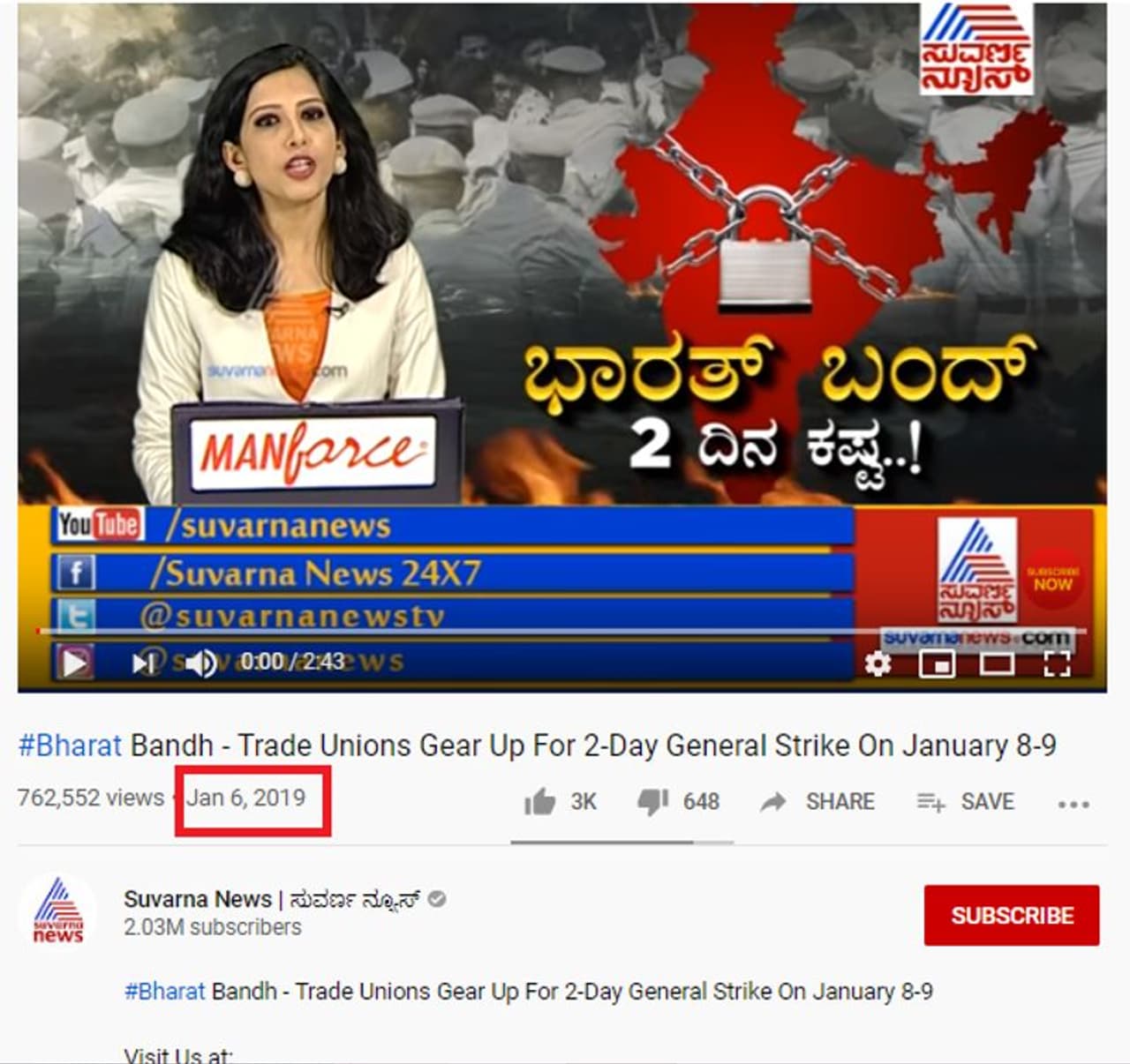 ಈ ವಿಡಿಯೋ 2019ರ ಜನವರಿ 6ರದ್ದಾಗಿದೆ. ಜನವರಿಯಲ್ಲಿ ಕಾರ್ಮಿಕ ಸಂಘಟನೆಗಳು ಹಲವು ಬೇಡಿಕೆಗಳನ್ನು ಈಡೇರಿಕೆಗೆ ಮನವಿ ಮಾಡಿ ಕರೆದಿದ್ದ ಭಾರತ್ ಬಂದ್ ವಿಡಿಯೋ ಇದಾಗಿದೆ.