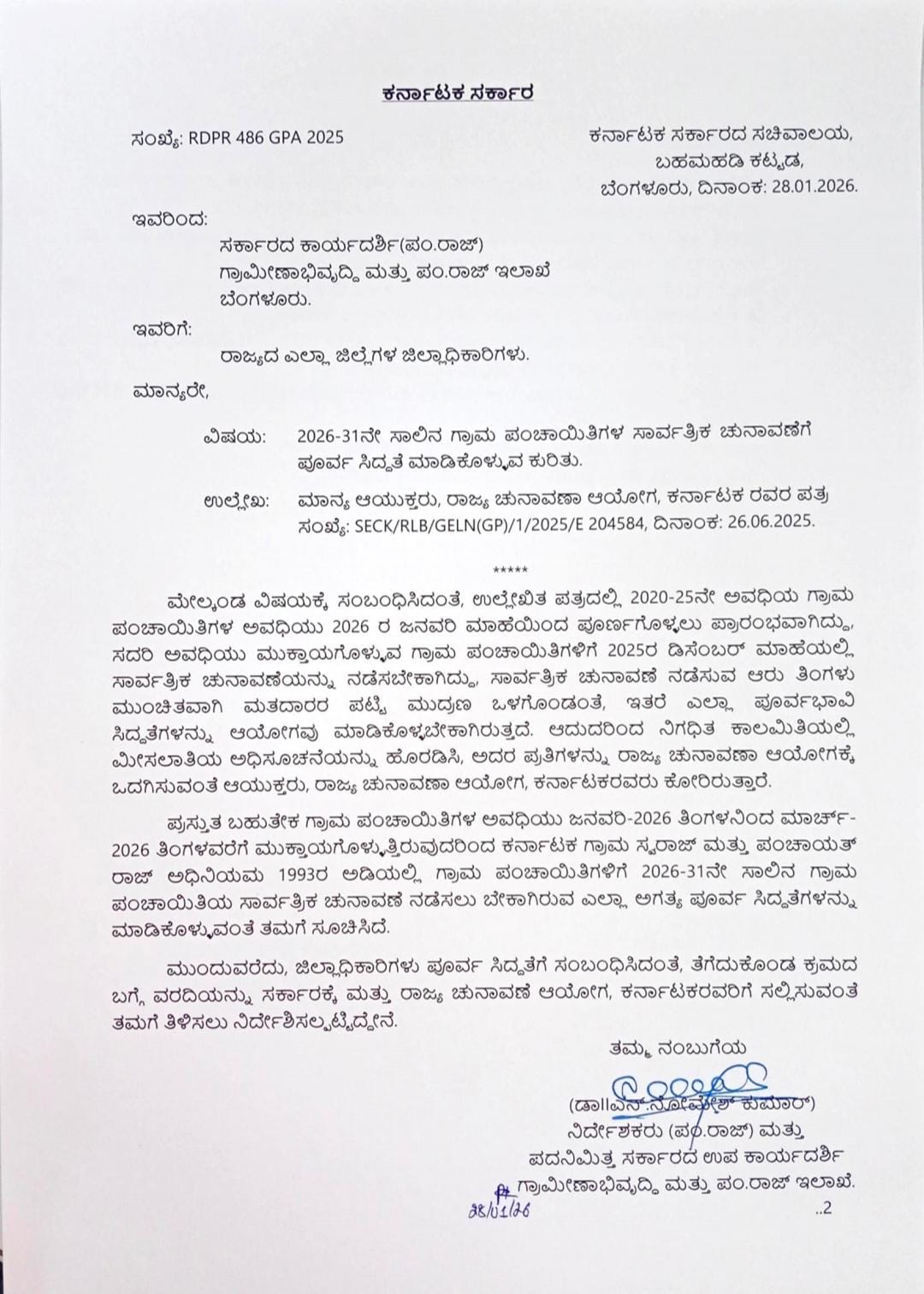 ಬೆಂಗಳೂರು (ಜ.29): ಕರ್ನಾಟಕದ ಗ್ರಾಮೀಣ ಭಾಗದಲ್ಲಿ ಮತ್ತೆ ರಾಜಕೀಯ ಚಟುವಟಿಕೆಗಳು ಗರಿಗೆದರಲಿವೆ. 2026-31ನೇ ಸಾಲಿನ ಗ್ರಾಮ ಪಂಚಾಯಿತಿಗಳ ಚುನಾವಣೆಗೆ ಪೂರ್ವ ಸಿದ್ಧತೆಗಳನ್ನು ಮಾಡಿಕೊಳ್ಳುವಂತೆ ರಾಜ್ಯ ಸರ್ಕಾರ ಅಧಿಕೃತ ಸೂಚನೆ ಹೊರಡಿಸಿದೆ. ಗ್ರಾಮೀಣಾಭಿವೃದ್ಧಿ ಹಾಗೂ ಪಂಚಾಯತ್ ರಾಜ್ ಇಲಾಖೆಯ ಕಾರ್ಯದರ್ಶಿಗಳು ರಾಜ್ಯದ ಎಲ್ಲಾ ಜಿಲ್ಲಾಧಿಕಾರಿಗಳಿಗೆ ಪತ್ರ ಬರೆದಿದ್ದು, ಚುನಾವಣಾ ಸಿದ್ಧತೆಗಳಿಗೆ ಚಾಲನೆ ನೀಡುವಂತೆ ನಿರ್ದೇಶಿಸಿದ್ದಾರೆ.