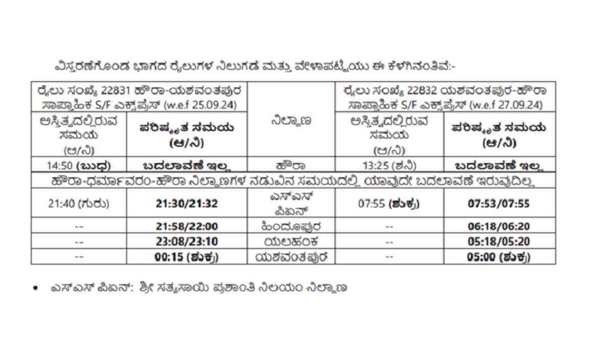 1. ಹೌರಾ-ಶ್ರೀ ಸತ್ಯಸಾಯಿ ಪ್ರಶಾಂತಿನಿಲಯಂ ನಿಲ್ದಾಣಗಳ ನಡುವೆ ಈ ಹಿಂದೆ ಕಾರ್ಯನಿರ್ವಹಿಸುತ್ತಿದ್ದ ರೈಲು ಸಂಖ್ಯೆ 22831, ಈಗ ಹೌರಾ ಮತ್ತು ಯಶವಂತಪುರ ನಿಲ್ದಾಣಗಳ ನಡುವೆ ಸೆಪ್ಟೆಂಬರ್ 25, 2024 ರಿಂದ ಜಾರಿಗೆ ಬರುವಂತೆ ಕಾರ್ಯ ನಿರ್ವಹಿಸಲಿದೆ. ಈ ರೈಲು ಶ್ರೀ ಸತ್ಯಸಾಯಿ ಪ್ರಶಾಂತಿ ನಿಲಯಂ (ಎಸ್ಎಸ್ ಪಿಏನ್) ನಲ್ಲಿ ಕೊನೆಗೊಳ್ಳುವ ಬದಲು ಯಶವಂತಪುರದವರೆಗೆ ತನ್ನ ಪ್ರಯಾಣವನ್ನು ವಿಸ್ತರಿಸಿದೆ.