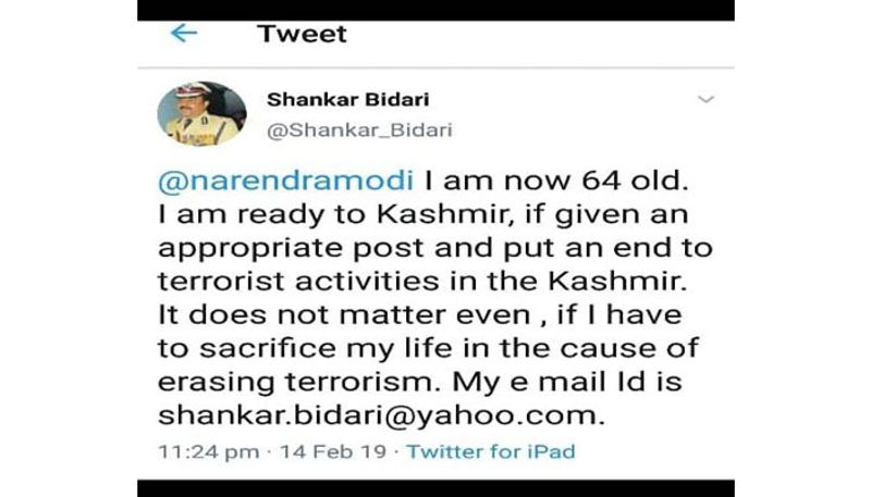 ಪ್ರಧಾನ ಮಂತ್ರಿ ನರೇಂದ್ರ ಮೋದಿ ಅವರಿಗೆ ಟ್ವೀಟ್ ಮಾಡಿದ ಬಿದರಿ ಅವರು ನನಗೆ ಈಗ 64 ವರ್ಷ ವಯಸ್ಸು. ನನಗೆ ಅವಕಾಶ ನೀಡಿದಲ್ಲಿ ನಾನು ಕಾಶ್ಮೀರಕ್ಕೆ ತೆರಳಲು ಸಿದ್ಧ ಎಂದು ಹೇಳಿದ್ದಾರೆ.