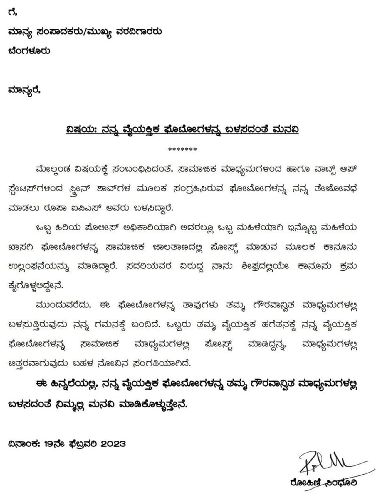 ಈ ಹಿನ್ನಲೆಯಲ್ಲಿ, ನನ್ನ ವೈಯಕ್ತಿಕ ಫೋಟೋಗಳನ್ನ ತಮ್ಮ ಮಾಧ್ಯಮಗಳಲ್ಲಿ ಬಳಸದಂತೆ ನಿಮ್ಮಲ್ಲಿ ಮನವಿ ಮಾಡಿಕೊಳ್ಳುತ್ತೇನೆ ಎಂದು ರೋಹಿಣಿ ಸಿಂಧೂರಿಯವರು ಬರೆದಿದ್ದಾರೆ.
