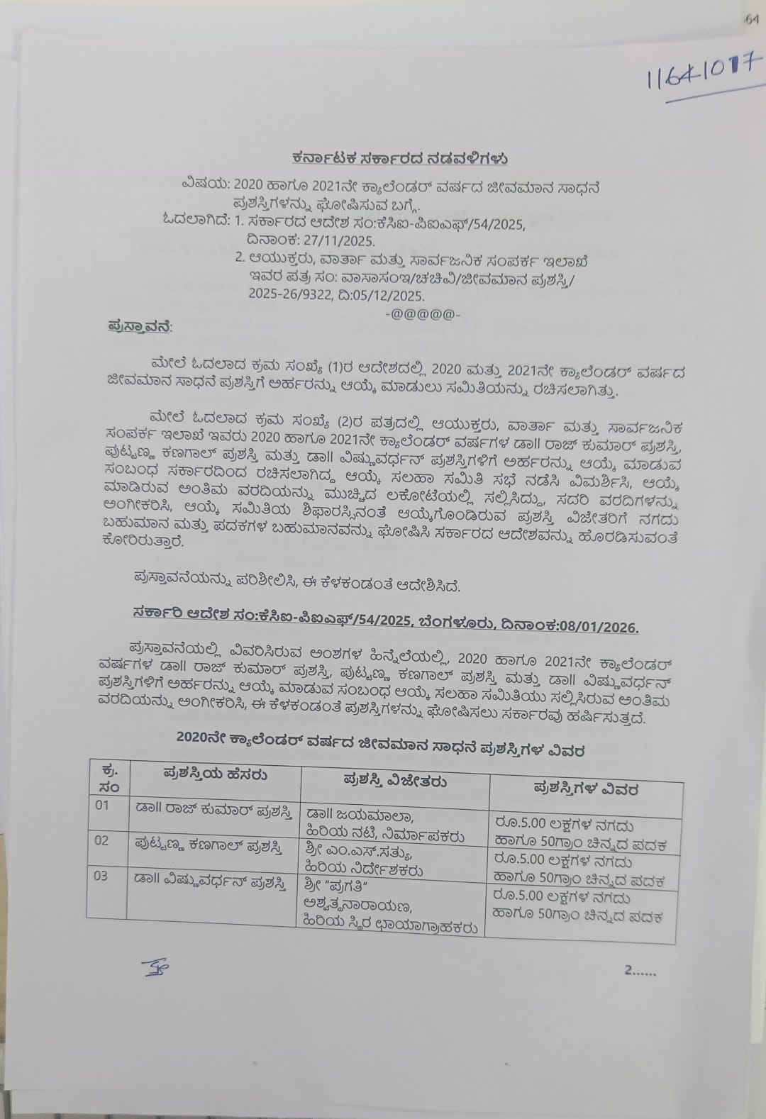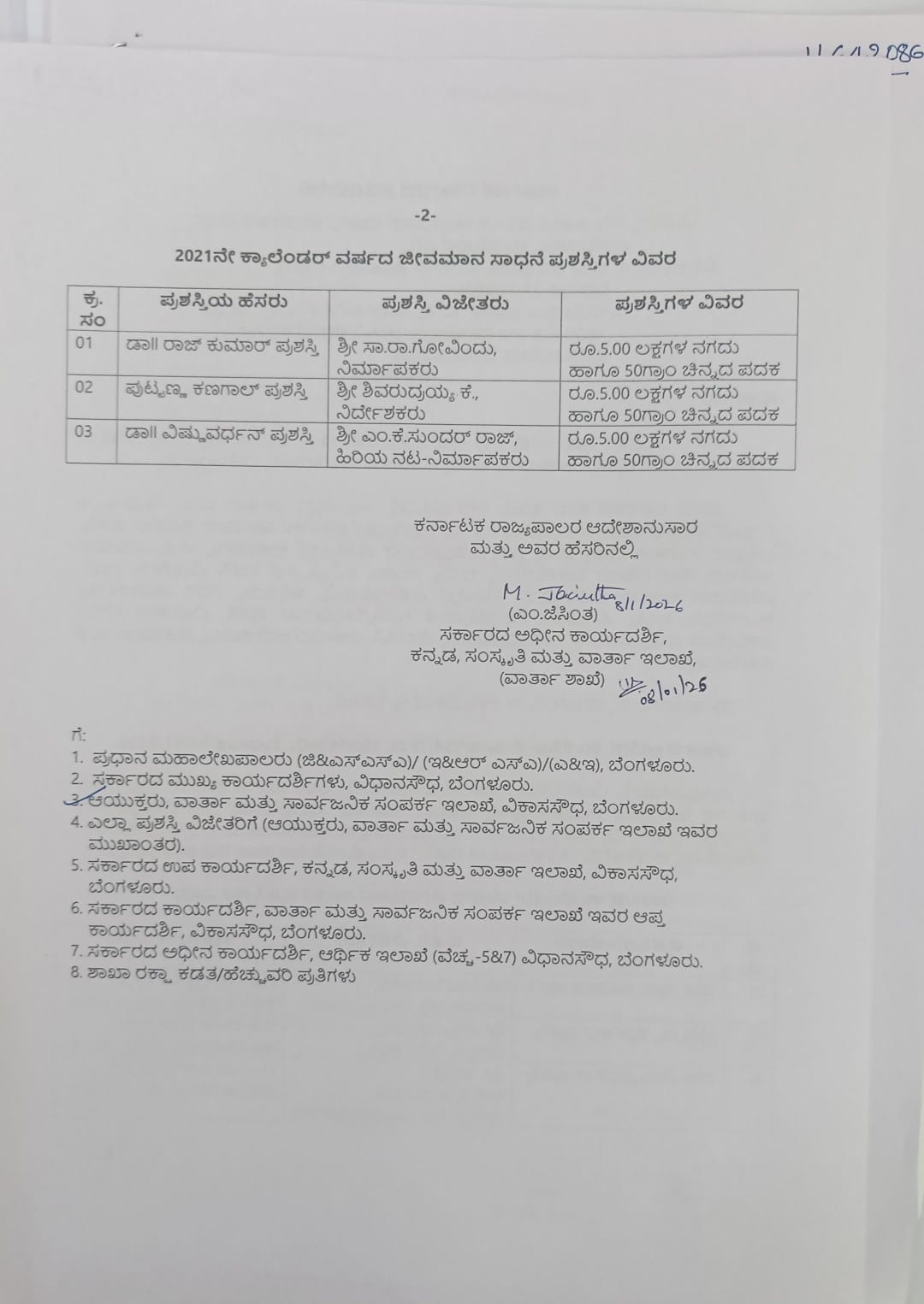 2020 ಹಾಗೂ 2021ನೇ ಕ್ಯಾಲೆಂಡರ್ ವರ್ಷಗಳ ಡಾ|| ರಾಜ್ ಕುಮಾರ್ ಪ್ರಶಸ್ತಿ, ಪುಟ್ಟಣ್ಣ ಕಣಗಾಲ್ ಪ್ರಶಸ್ತಿ ಮತ್ತು ಡಾ॥ ವಿಷ್ಣುವರ್ಧನ್ ಪ್ರಶಸ್ತಿಗಳಿಗೆ ಅರ್ಹರನ್ನು ಆಯ್ಕೆ ಮಾಡುವ ಸಂಬಂಧ ಆಯ್ಕೆ ಸಲಹಾ ಸಮಿತಿಯು ಸಲ್ಲಿಸಿರುವ ಅಂತಿಮ ವರದಿಯನ್ನು ಅಂಗೀಕರಿಸಿ, ಈ ಕೆಳಕಂಡಂತೆ ಪ್ರಶಸ್ತಿಗಳನ್ನು ಘೋಷಿಸಲು ಸರ್ಕಾರವು ಹರ್ಷಿಸುತ್ತದೆ ಎಂದು ಪ್ರಕಟಣೆಯಲ್ಲಿ ತಿಳಿಸಲಾಗಿದೆ.
