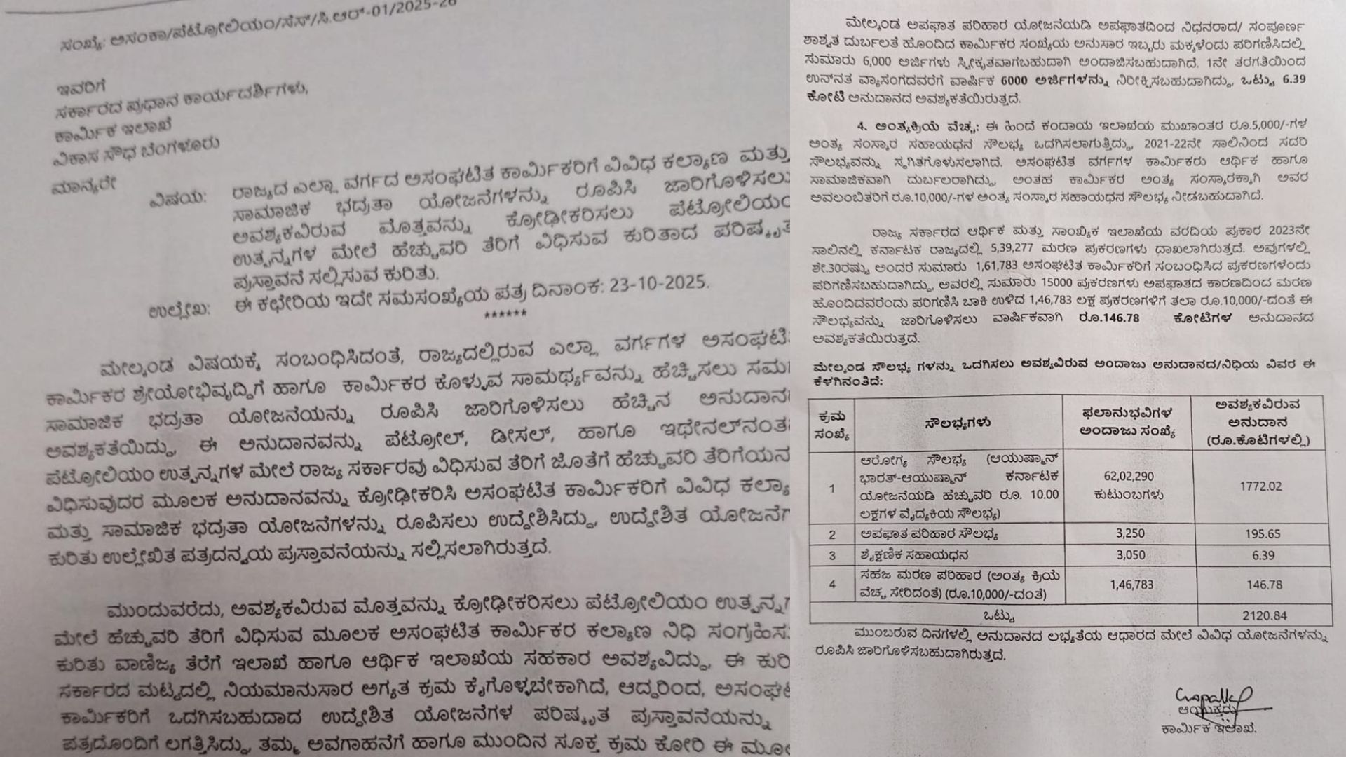 ಇದರಲ್ಲಿ 1772 ಕೋಟಿ ಅಸಂಘಟಿತ ಕಾರ್ಮಿಕರ ಆರೋಗ್ಯ ಸೌಲಭ್ಯಕ್ಕಾಗಿಯೇ ವೆಚ್ಚ ಮಾಡುವ ಯೋಜನೆ ರೂಪಿಸಲಾಗಿದೆ. ಈಗಾಗಲೇ ವಿಧೇಯಕದ ಡ್ರಾಫ್ಟ್ಅನ್ನು ಸಂತೋಷ್ ಲಾಡ್ ಸಿದ್ದಪಡಿಸಿದ್ದಾರೆ. ಲಾಡ್ ಪ್ರಯತ್ನಕ್ಕೆ ಕ್ಯಾಬಿನೆಟ್ ನಲ್ಲಿ ಅನುಮೋದನೆ ದೊರಕುವ ಸಾಧ್ಯತೆ ಇದ್ದು, ಗುರುವಾರದ ಕ್ಯಾಬಿನೆಟ್ನಲ್ಲಿ ವಿಧೇಯಕ ಚರ್ಚೆ ಆಗುವ ಸಾಧ್ಯತೆ ಇದೆ.