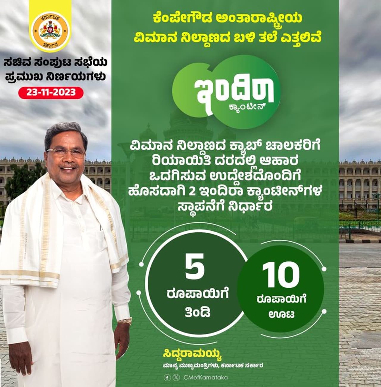 ಶಿಘ್ರವಾಗಿ, ಬೆಂಗಳೂರಿನ ವಿಮಾನ ನಿಲ್ದಾಣದಲ್ಲಿ ಇಂದಿರಾ ಕ್ಯಾಂಟೀನ್ ಆರಂಭ ಮಾಡಲಾಗುತ್ತಿದೆ. ಈ ಬಗ್ಗೆ ಸ್ವತಃ ಮಾಹಿತಿ ಹಂಚಿಕೊಂಡಿರುವ ಮುಖ್ಯಮಂತ್ರಿ ಸಿದ್ದರಾಮಯ್ಯ ಅವರು, 'ಬೆಂಗಳೂರಿನ ಅಂತಾರಾಷ್ಟ್ರೀಯ ವಿಮಾನ ನಿಲ್ದಾಣದ ಕಾರ್ಮಿಕರಿಗೆ, ವಾಹನ ಚಾಲಕರಿಗೆ ಹಾಗೂ ಸುತ್ತಲಿನ ಜನರಿಗೆ ರಿಯಾಯಿತಿ ದರದಲ್ಲಿ ಗುಣಮಟ್ಟದ ಆಹಾರ ಒದಗಿಸುವ ಉದ್ದೇಶದೊಂದಿಗೆ ವಿಮಾನ ನಿಲ್ದಾಣದ ವಾಹನ ಪಾರ್ಕಿಂಗ್ ಪ್ರದೇಶದಲ್ಲಿ ಗುರುತಿಸಲಾದ ಸ್ಥಳದಲ್ಲಿ ನೂತನವಾಗಿ 2 ಇಂದಿರಾ ಕ್ಯಾಂಟೀನ್ ಗಳನ್ನು ಆರಂಭಿಸಲು ಸಚಿವ ಸಂಪುಟ ಸಭೆಯಲ್ಲಿ ನಿರ್ಧರಿಸಲಾಗಿದೆ' ಎಂದು ತಮ್ಮ ಸಾಮಾಜಿಕ ಜಾಲತಾಣದಲ್ಲಿ ಮಾಹಿತಿಯನ್ನು ಹಂಚಿಕೊಂಡಿದ್ದಾರೆ.
