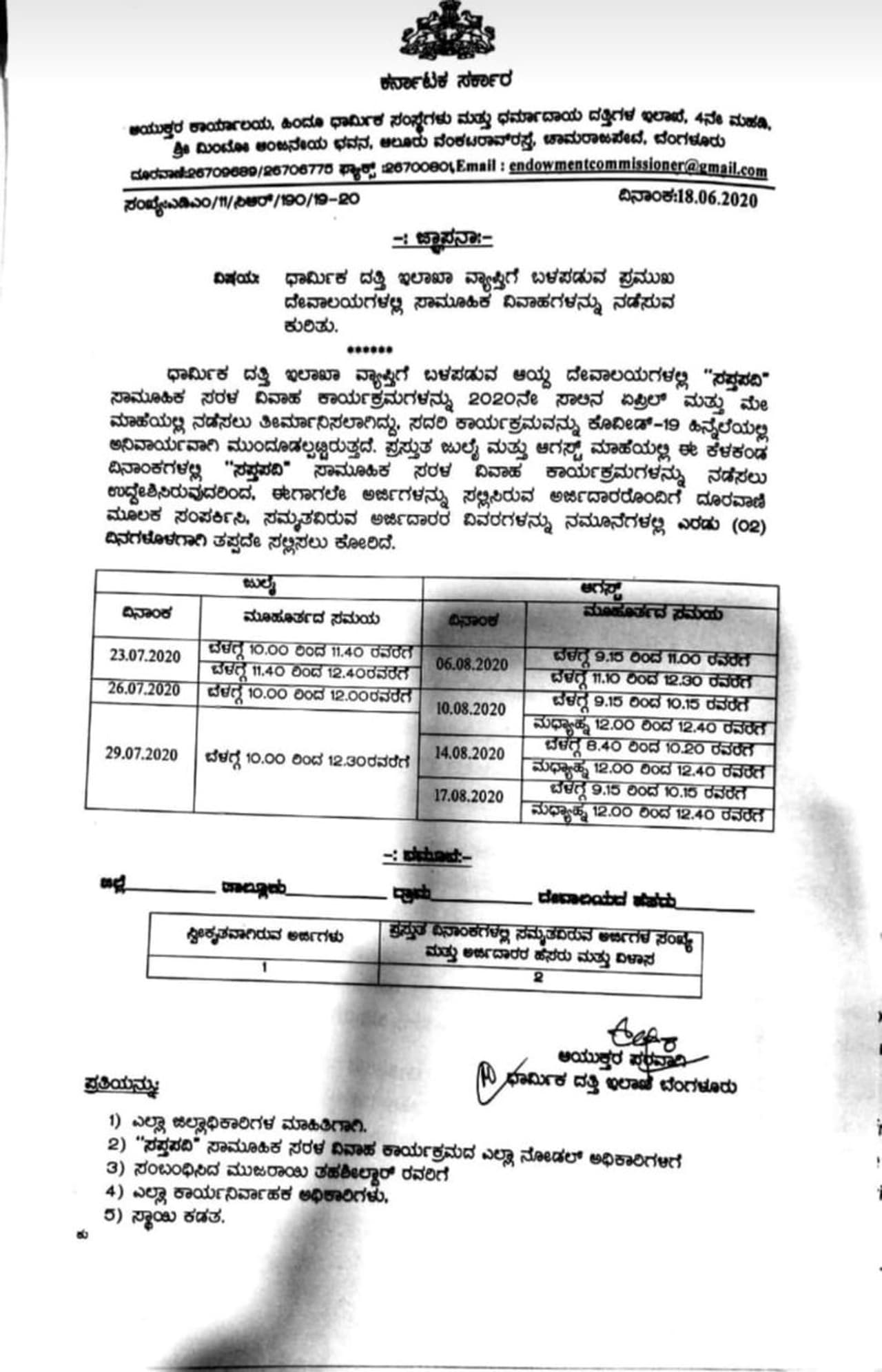 ಜುಲೈ 23, 26 ಮತ್ತು 29 ರಂದು ರಂದು ಸಾಮೂಹಿಕ ಮದುವೆ ನಡೆಯಲಿದೆ. ಅಲ್ಲದೇ ಆಗಸ್ಟ್ 6,10, 14 ಮತ್ತು 17 ತಾರೀಖಿನಂದು ಸಹ ಸಾಮೂಹಿಕ ವಿವಾಹವನ್ನು ಆಯೋಜಿಸಲಾಗಿದ್ದ, ಈ ಬಗ್ಗೆ ಧಾರ್ಮಿಕ ದತ್ತಿ ಇಲಾಖೆ ಇಂದು (ಶನಿವಾರ) ಅಧಿಕೃತ ಆದೇಶವನ್ನು ಹೊರಡಿಸಿದೆ.