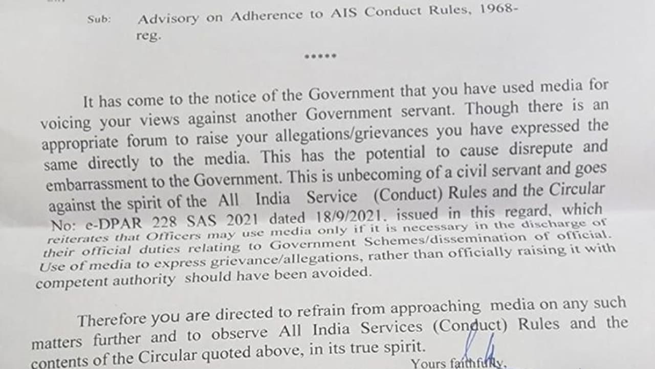 ಸರ್ಕಾರದ ನೋಟಿಸ್ನಲ್ಲಿ ಏನಿದೆ.?: ಇಬ್ಬರೂ ಸರ್ಕಾರಿ ಅಧಿಕಾರಿಗಳು ಆಗಿದ್ದಿ ಮಾಧ್ಯಮಗಳ ಮುಂದೆ ಯಾವುದೇ ಹೇಳಿಕೆ ನೀಡಬಾರದು. ಇದರಲ್ಲಿ ದೂರಿಗಳು, ಮನವಿಗಳು ಅಥವಾ ಇನ್ಯಾವುದೇ ಆರೋಪಗಳನ್ನು ಮಾಡುವಂತಿಲ್ಲ. ನೀವು ಸಾರ್ವಜನಿಕವಾಗಿ ಶಾಂತಿ ಕಾಪಾಡಬೇಕು. ಆಲ್ ಇಂಡಿಯಾ ಸರ್ವೀಸ್ ಕಂಡಕ್ಟ್ ರೂಲ್ಸ್ ಅನ್ವಯ ನಡೆದುಕೊಳ್ಳಬೇಕು. ನೀವು ಇನ್ನುಮುಂದೆ ಯಾವುದೇ ಕಾರಣಕ್ಕೂ ಆರೋಪ, ಪ್ರತ್ಯಾರೋಪ ಸೇರಿ ಸರ್ಕಾರದ ಅಧಿಕಾರವನ್ನು ಅಥವಾ ಸೇವೆಯ ಕುರಿತಾದ ಮಾಹಿತಿಗಳನ್ನು ಮಾಧ್ಯಮಗಳ ಮುಂದೆ ಹಂಚಿಕೊಳ್ಳಬಾರದು ಎಂದು ತಿಳಿಸಿದೆ.