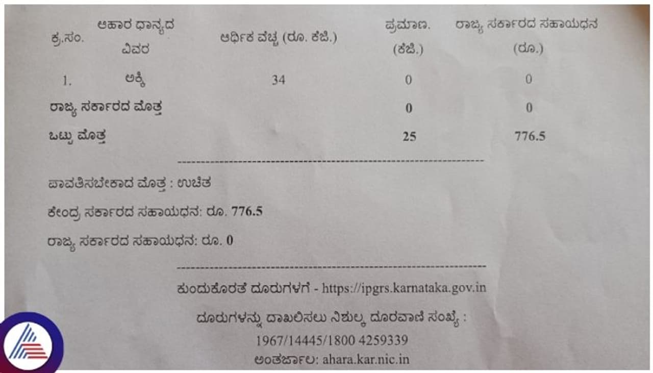 ರಾಜ್ಯದ ಪಡಿತರ ಕಾರ್ಡ್ದಾರರಿಗೆ ವಿತರಿಸುವ ಅಕ್ಕಿಯಲ್ಲಿ ರಾಜ್ಯ ಸರ್ಕಾರದ ಅನ್ನಭಾಗ್ಯ ಯೋಜನೆ ಪಾಲು ಶೂನ್ಯವಾಗಿದೆ. ಈ ಬಗ್ಗೆ ಕೇಂದ್ರ ಸರ್ಕಾರ ರಶೀದಿಯಲ್ಲಿ ನಮೂದಿಸಿದೆ.