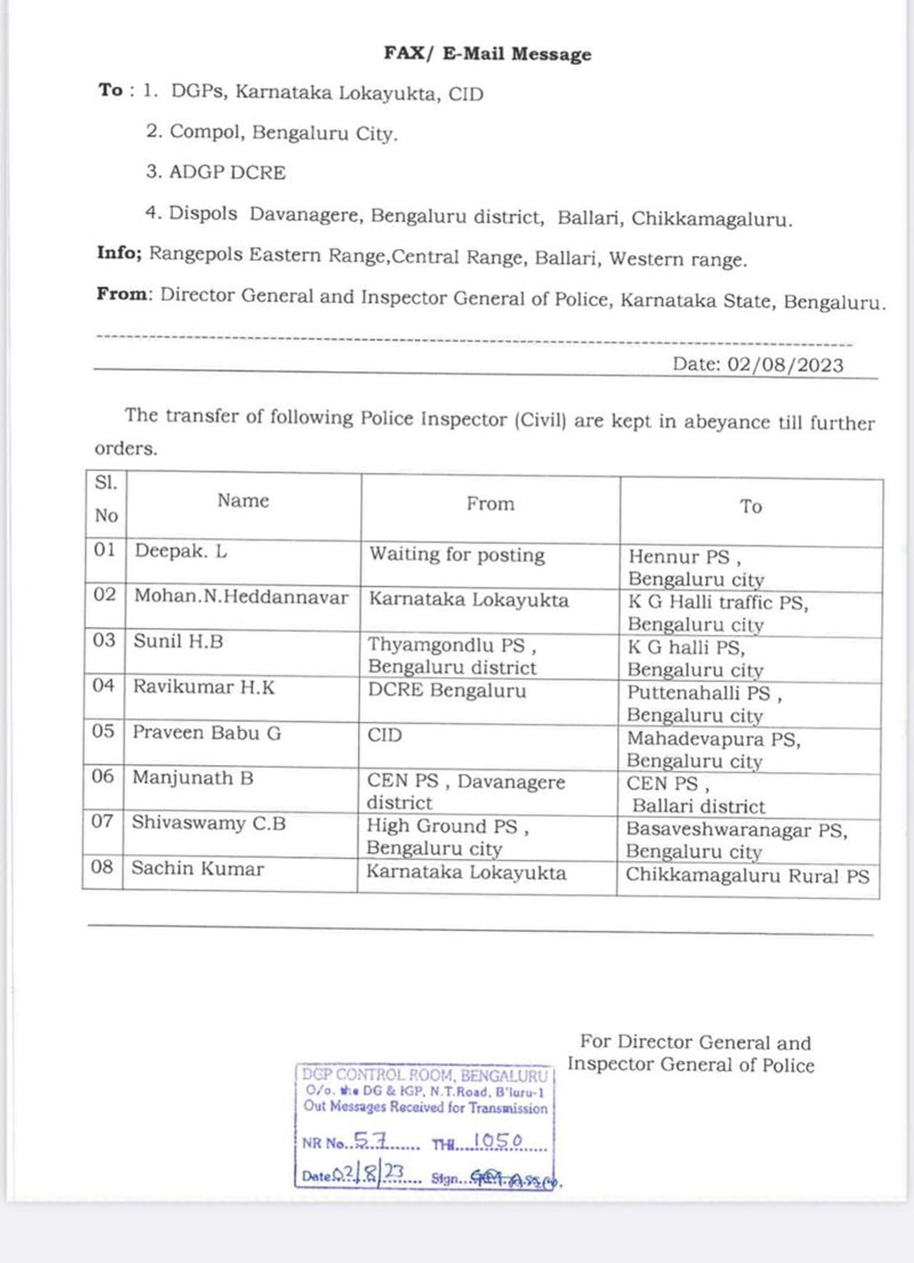 - ವರ್ಗಾವಣೆ ಆದೇಶ ತಡೆಹಿಡಿದ ಇನ್ಸ್ಪೆಕ್ಟರ್ಗಳ ವಿವರ ಇಲ್ಲಿದೆ: