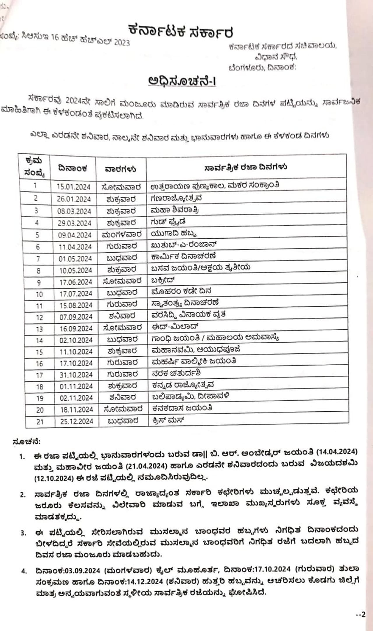 ರಾಜ್ಯ ಸರ್ಕಾರದಿಂದ 2ನೇ ಮತ್ತು 4ನೇ ಶನಿವಾರಗಳು, ಭಾನುವಾರಗಳನ್ನು ಹೊರತುಪಡಿಸಿ 2024ನೇ ಸಾಲಿನಲ್ಲಿ ಒಟ್ಟು 21 ಸಾರ್ವಜನಿಕರ ರಜಾ ದಿನಗಳ ಸಾರ್ವತ್ರಿಕ ರಜಾ ದಿನಗಳೆಂದು ಘೋಷಿಸಲಾಗಿದೆ.